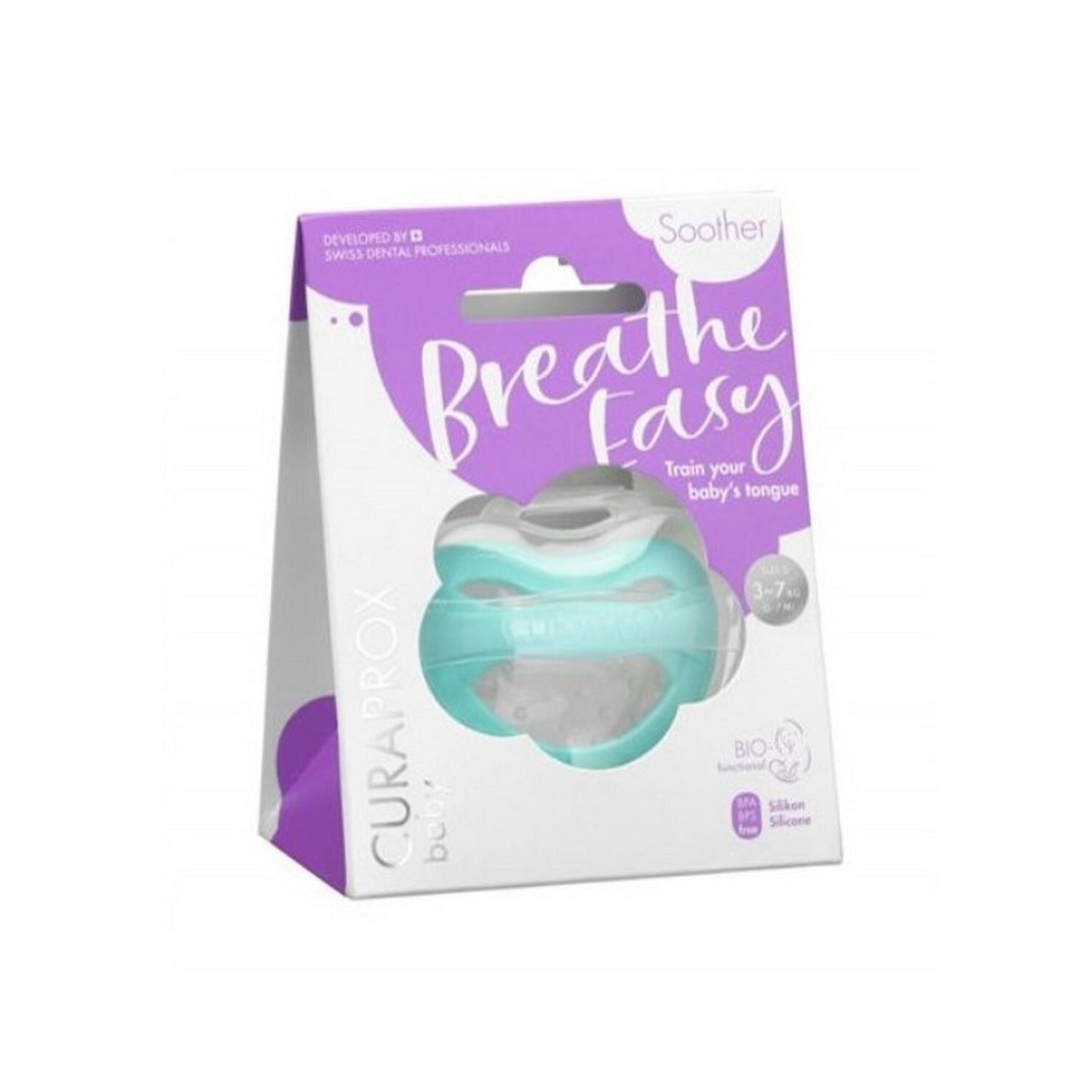 Curaprox Baby Breathe Easy Chupeta Silicone Turquesa 0-M es una chupeta diseñada para bebés desde el nacimiento hasta los 7 meses, recomendada para aquellos que pesan entre 3 y 7 kg. Esta alternativa inteligente a las chupetas tradicionales y al uso del dedo pulgar promueve una salud bucal adecuada, evitando deformaciones en la mandíbula y desplazamientos dentales.