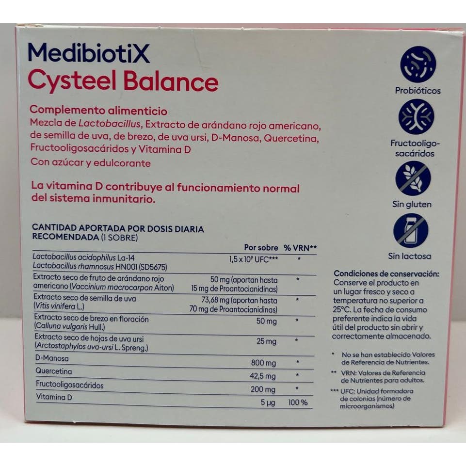 Cysteel Balance 28sobres es un complemento alimenticio a base de probióticos y prebióticos con arándano rojo que ayuda a mantener una buena salud vaginal y de las vías urinarias. Asimismo, está enriquecido con vitamina D, D-manosa y extracto de semilla de uva. Asimismo, ayuda a equilibrar la microbiota vaginal y a eliminar las bacterias que pueden llegar a causar infección de orina. Contiene 28 sobres.