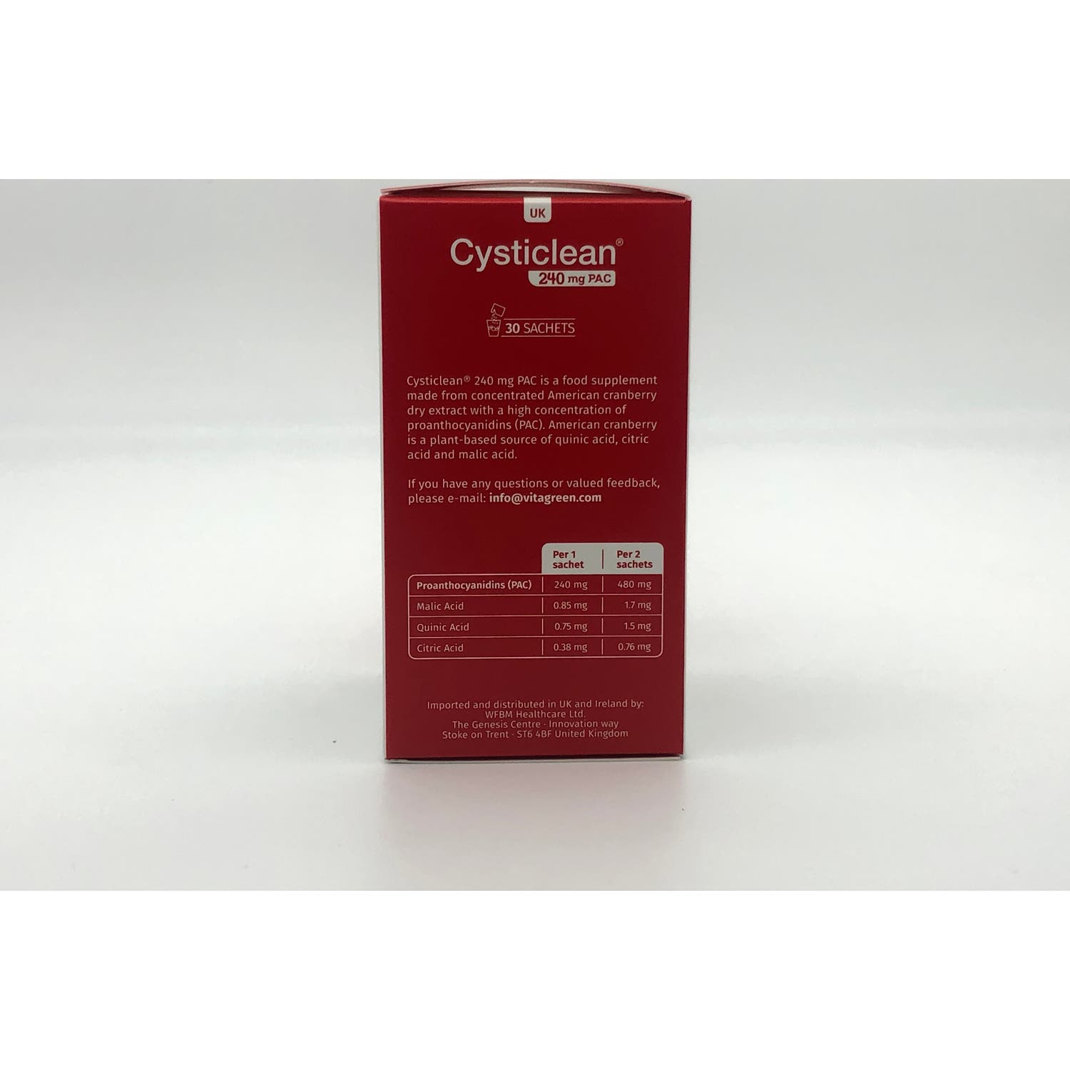 Su composición natural es una fuente vegetal deácido quínico, ácido cítrico y ácido málico. Contiene extracto seco y concentrado de arándano rojo americano y vitamina C. Asimismo, incluye la mínima concentración garantizada de PAC, que evita la adhesión de la bacteria. Además, no contiene gluten, sin lactosa y sin azúcares añadidos.