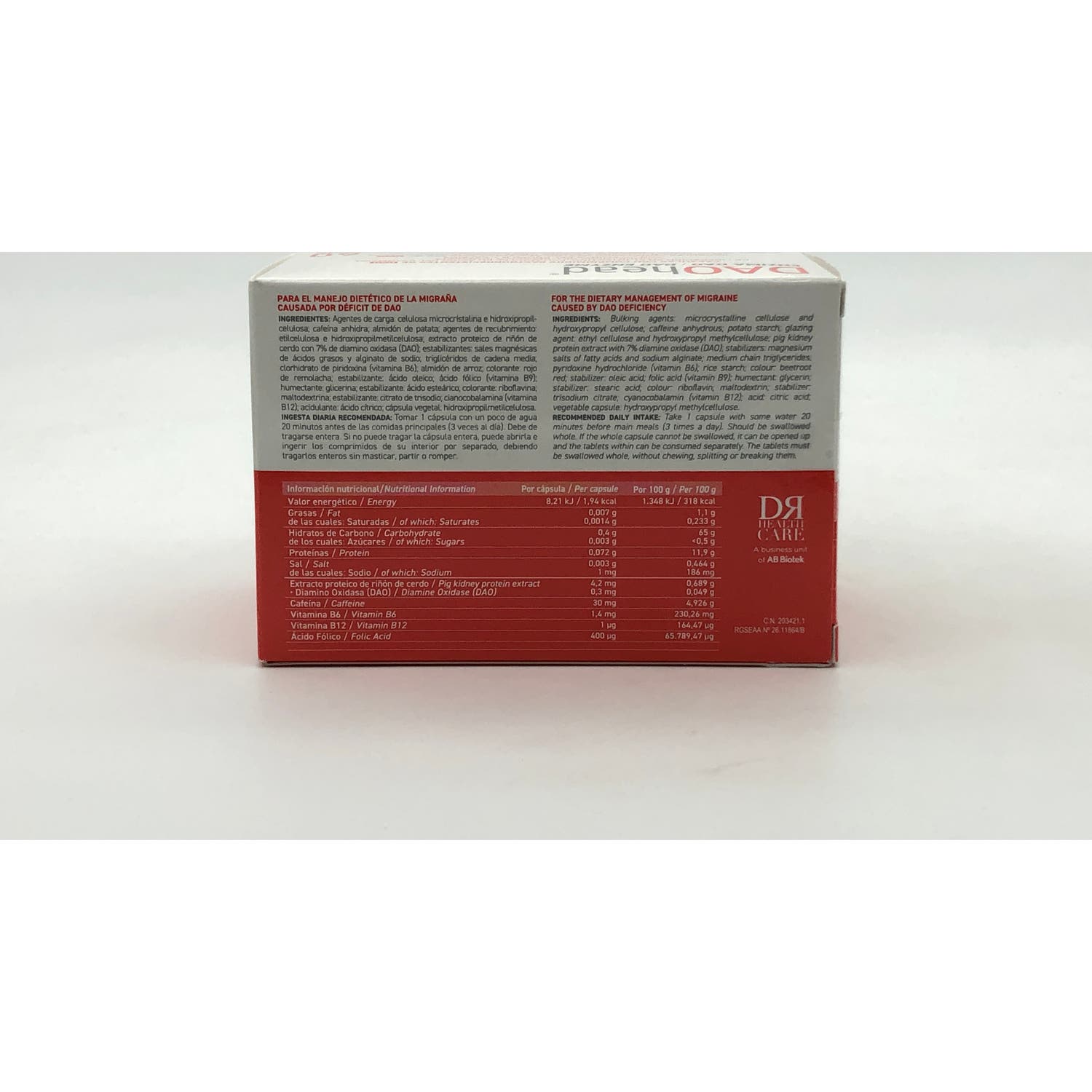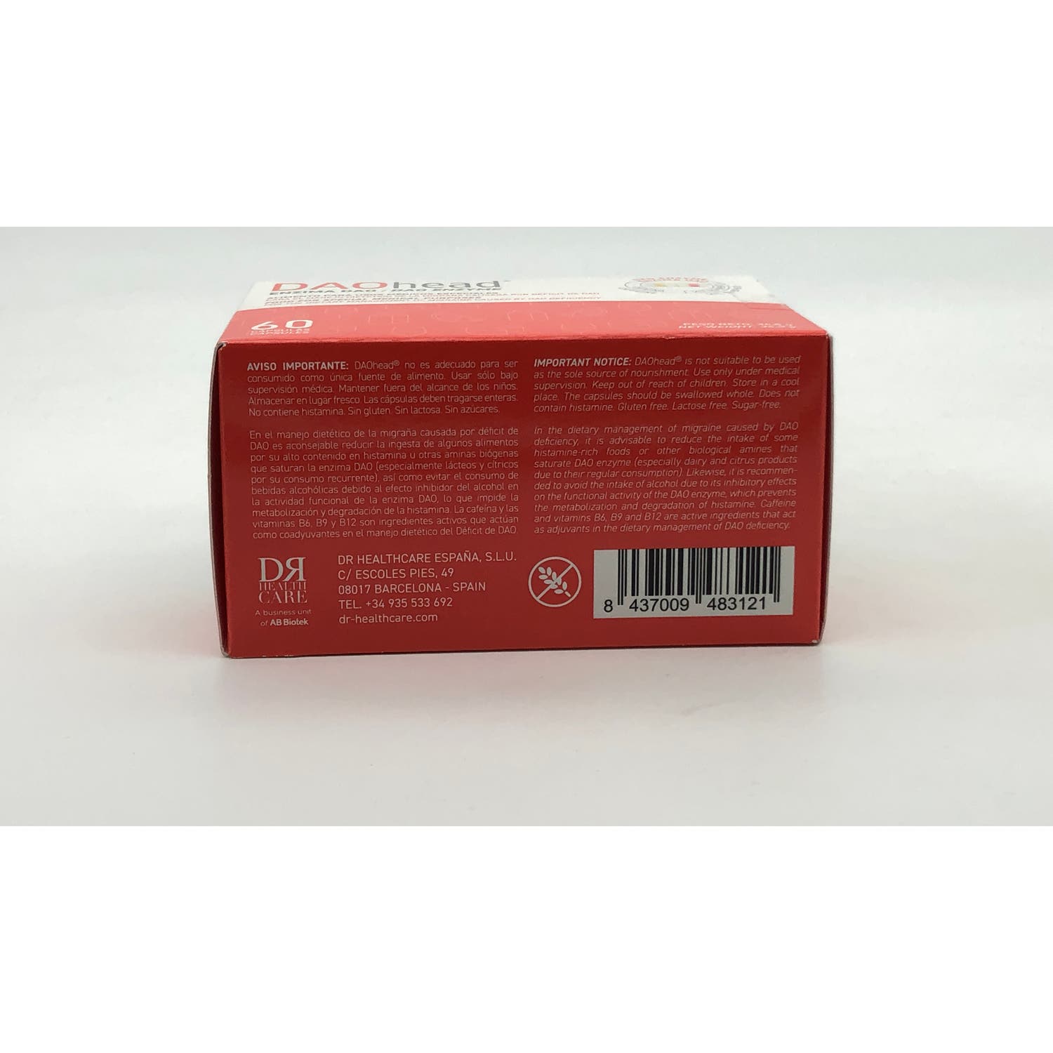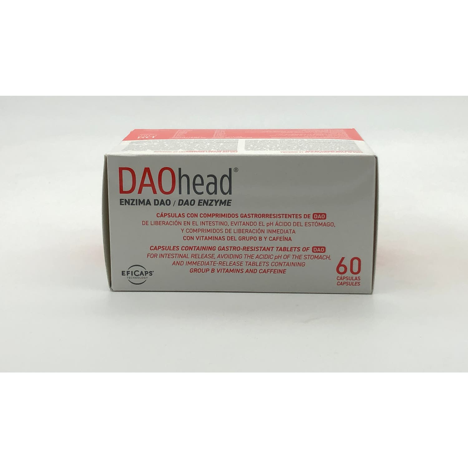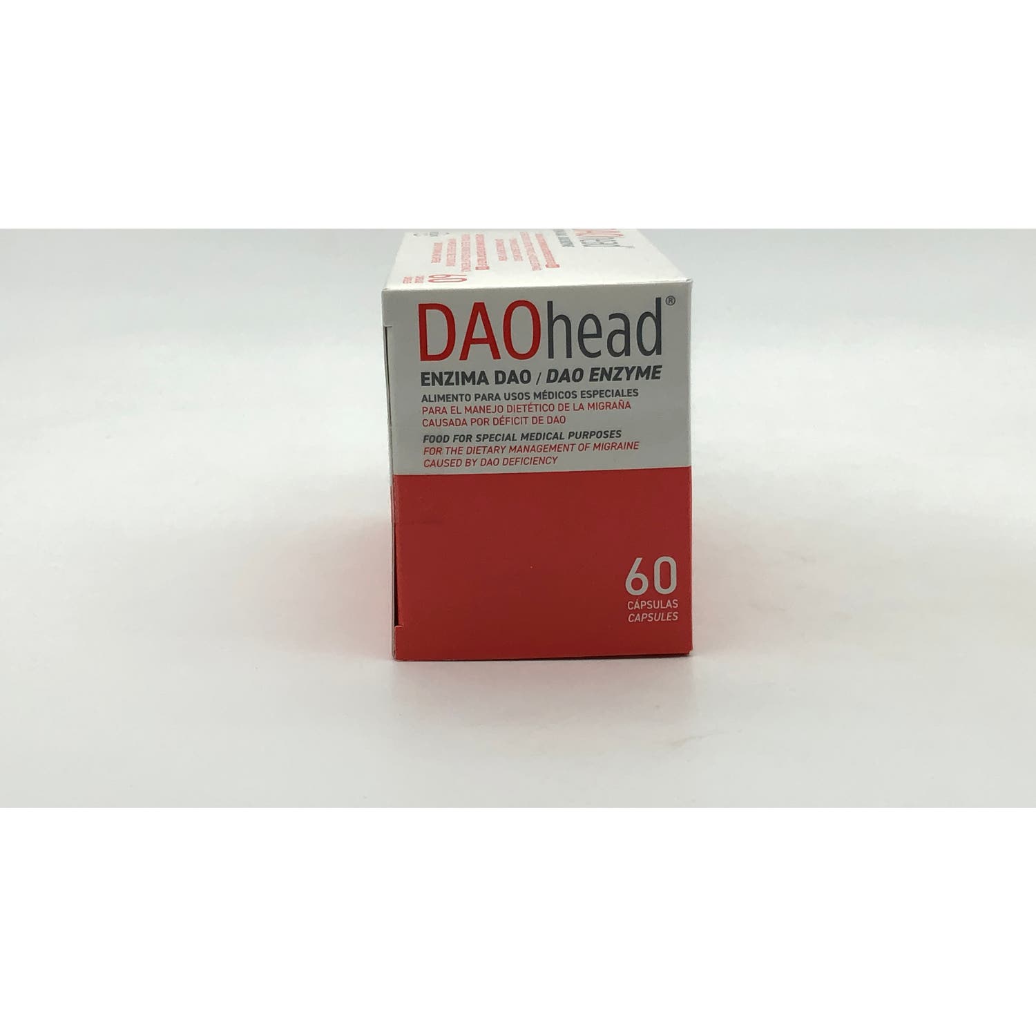 DAOhead 60caps es un alimento para usos médicos especiales, recomendado en casos de migraña generada por déficit de Dioamino Oxidasa (DAO) y/o intolerancia a la histamina. La DAO complementa la enzima del organismo que está encargada de metabolizar la histamina. Con este complemento, aumenta la cantidad de DAO en el intestino delgado y así, su capacidad de degradar histamina, acelerando su procesamiento en el tubo digestivo.