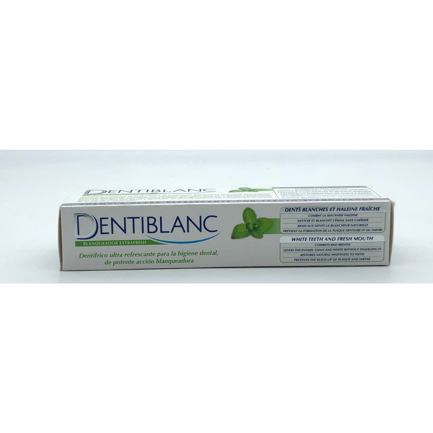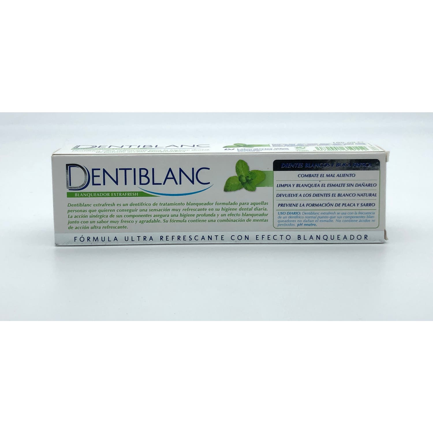 La fórmula de Dentiblanc Extrafresh pasta dental contiene una combinación de menta y mentol de acción ultra refrescante, dejando un aliento fresco y mejorado.