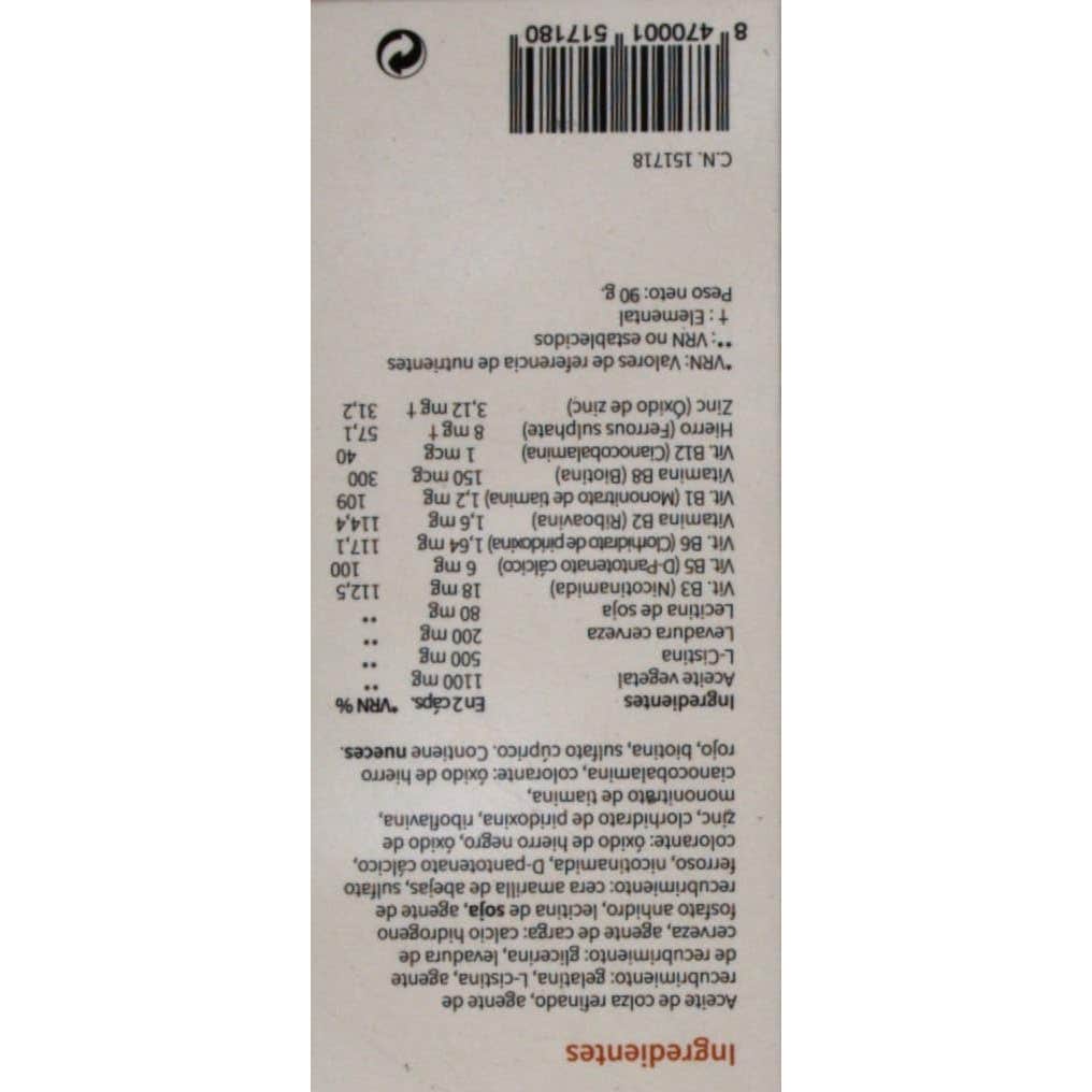Aceite vegetal, levadura de cerveza, L-Cisitna, vitaminas (B1, B2, B3, B6, ácido pantoténico, cianocobalamina 0,1% y biotina) y minerales (calcio, hierro, zinc y cobre).