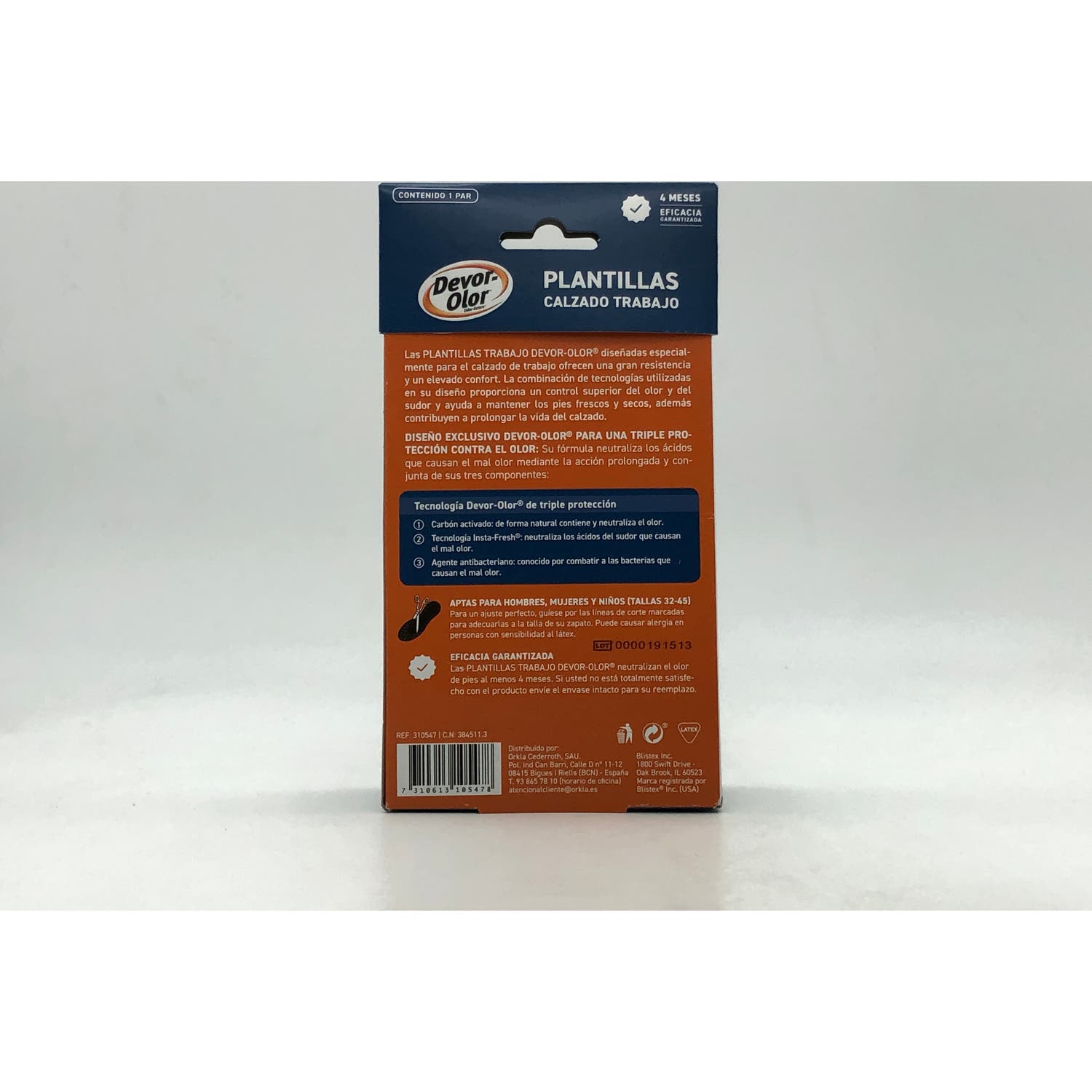 Devor Olor Súper plantillas 2uds son unas plantillas de larga duración que ayudan a eliminar los malos olores del calzado. Consiguen eliminar el olor y absorben el sudor, neutralizando los ácidos que causan el mal olor. Su acción prolongada, instantánea y conjunta se origina a partir de sus tres componentes principales: carbón activado, insta-fresh, y agente anti-bacterial.