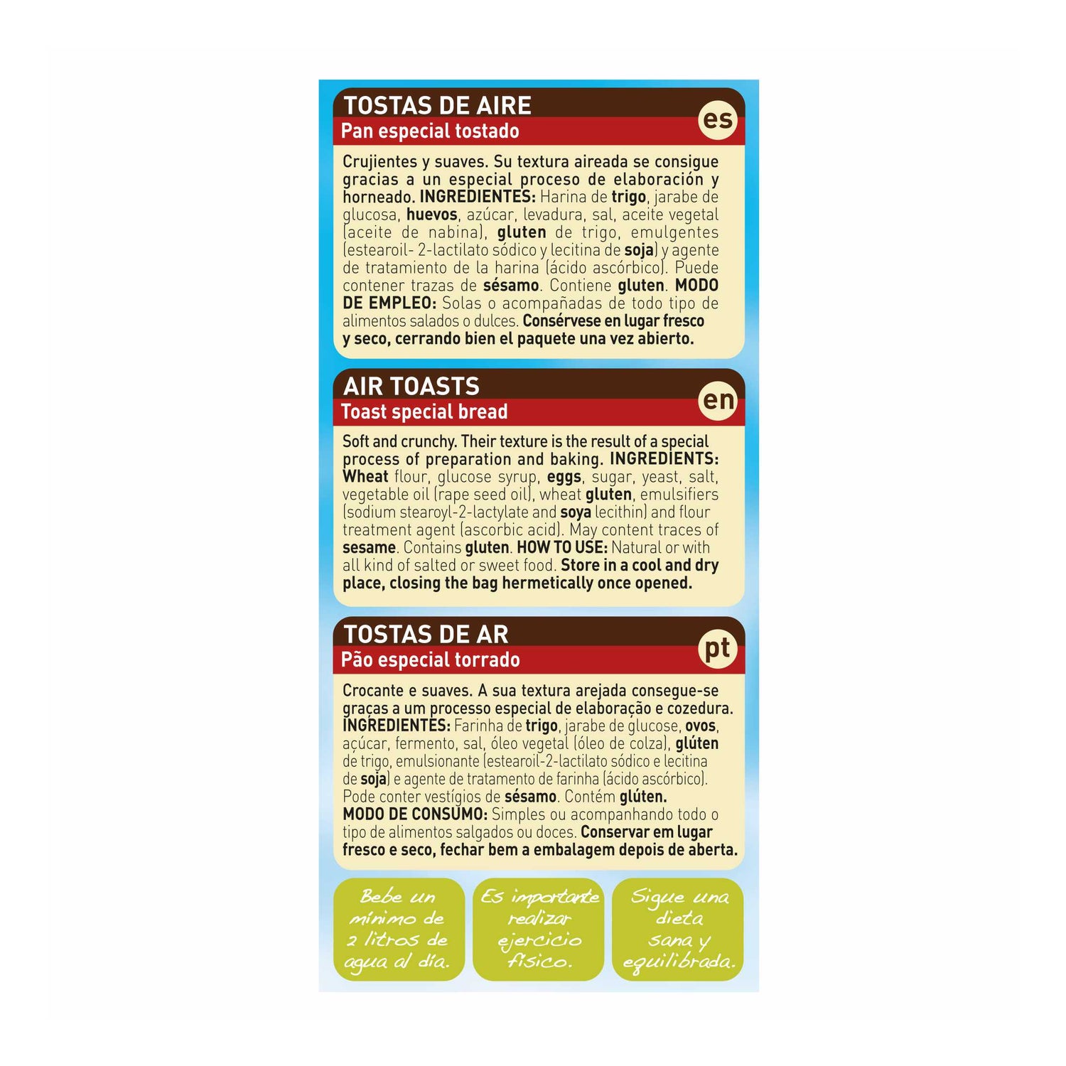 Tostadas de textura aireada, elaborada mediante un especial proceso de elaboración y horneado con el que se obtiene una tostada con volumen, muy ligera y crujiente. Resultan idóneas para tomar solas o acompañadas de todo tipo de alimentos, salados o dulces.