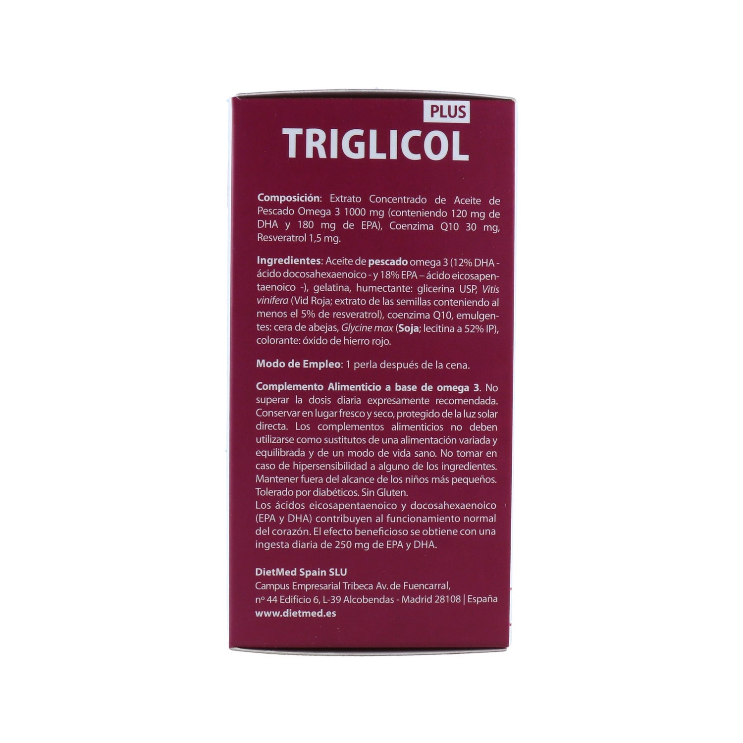 Omega 3 (1000 mg), EPA (180 mg), DHA (120 mg), Coenzima Q10 (30 mg), Resveratrol (1.5 mg), Extracto de Vid roja, Aceite de Pescado, Coenzima Q-10.