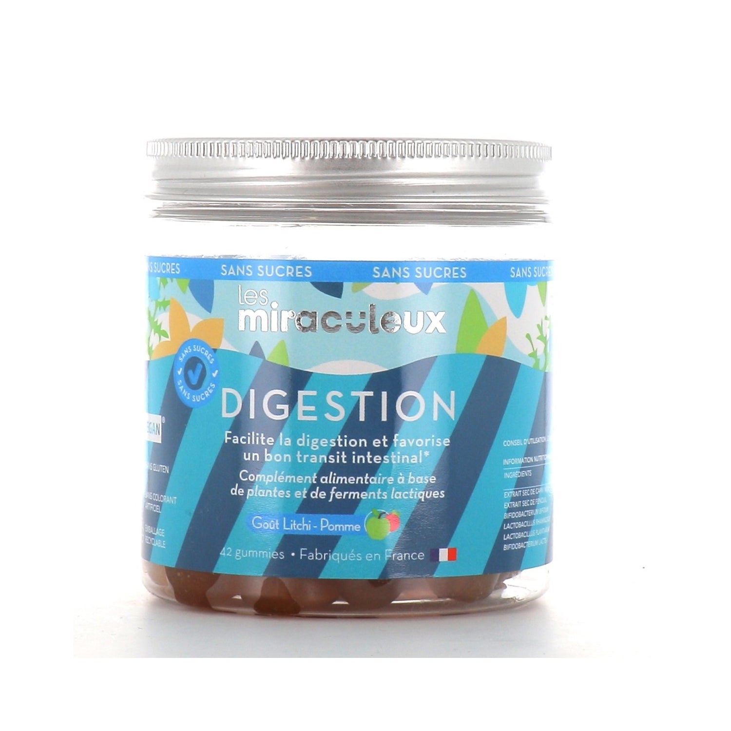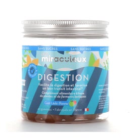 Les Miraculeux Digestion 42 Gummies es un complemento alimenticio que facilita la digestión y favorece el tránsito intestinal. Su fórmula está compuesta por hinojo, alcaravea negra y 4 cepas de fermentos lácticos que ayudan a equilibrar la flora intestinal y a mejorar la digestión. A pesar de su forma y textura de caramelo, estas gominolas tienen un contenido muy bajo en azúcar, con sólo 15kcal para 2 gominolas. Aromas naturales de manzana y lichi.Tarros y tapas 100% reciclables.Fabricado en Francia.Los complementos alimenticios nunca deben sustituir una alimentación sana y equilibrada.