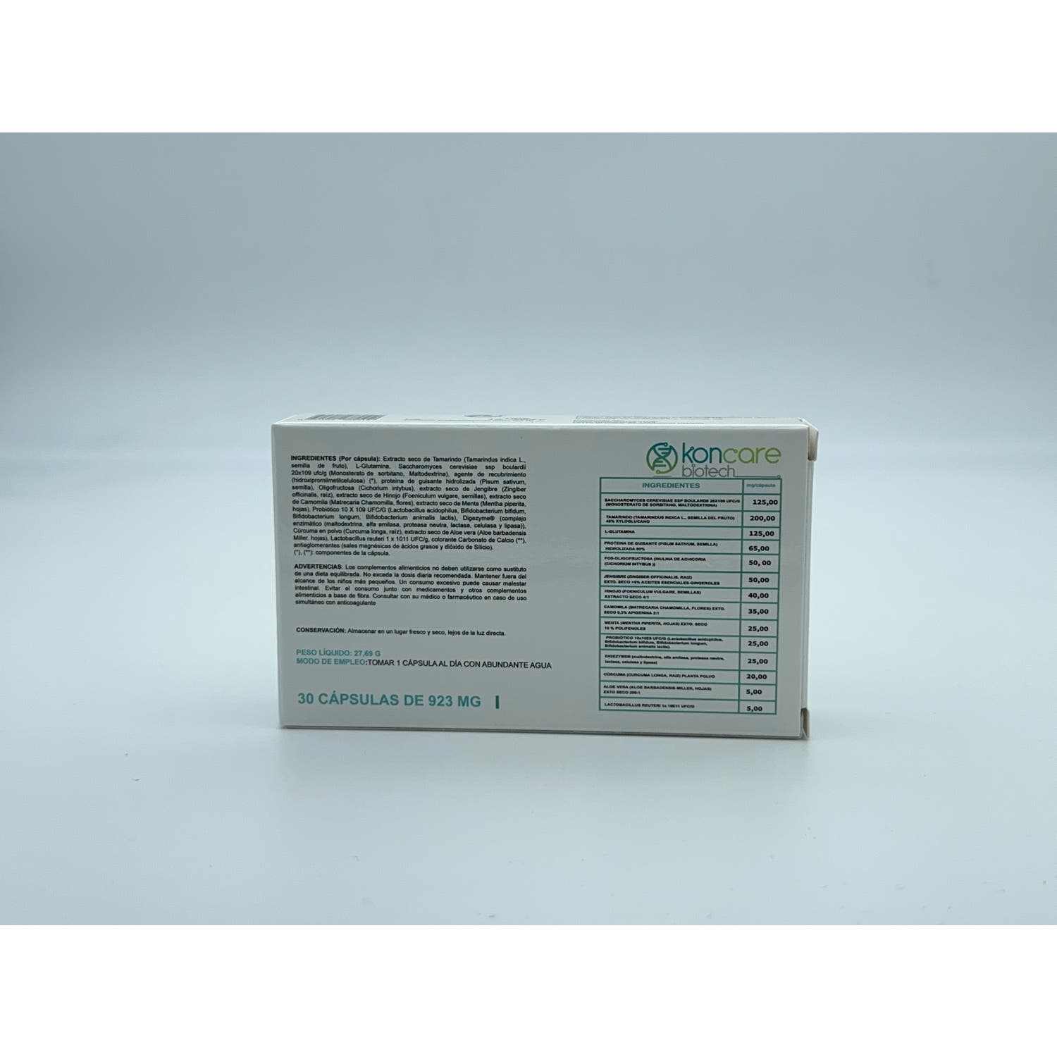 Elaborado a base de aloe vera, camomila, hinojo, cúrcuma y proteína de guisante, lo cual resulta en un efecto relajante, en una reparación en la pared intestinal y en un incremento de la motilidad gastrointestinal. Además, aporta un efecto hidratante y analgésico, así como una capa de biofilm para que la flora bacteriana se mantenga en el tracto digestivo.