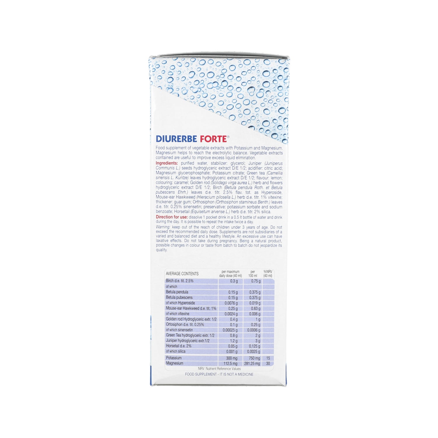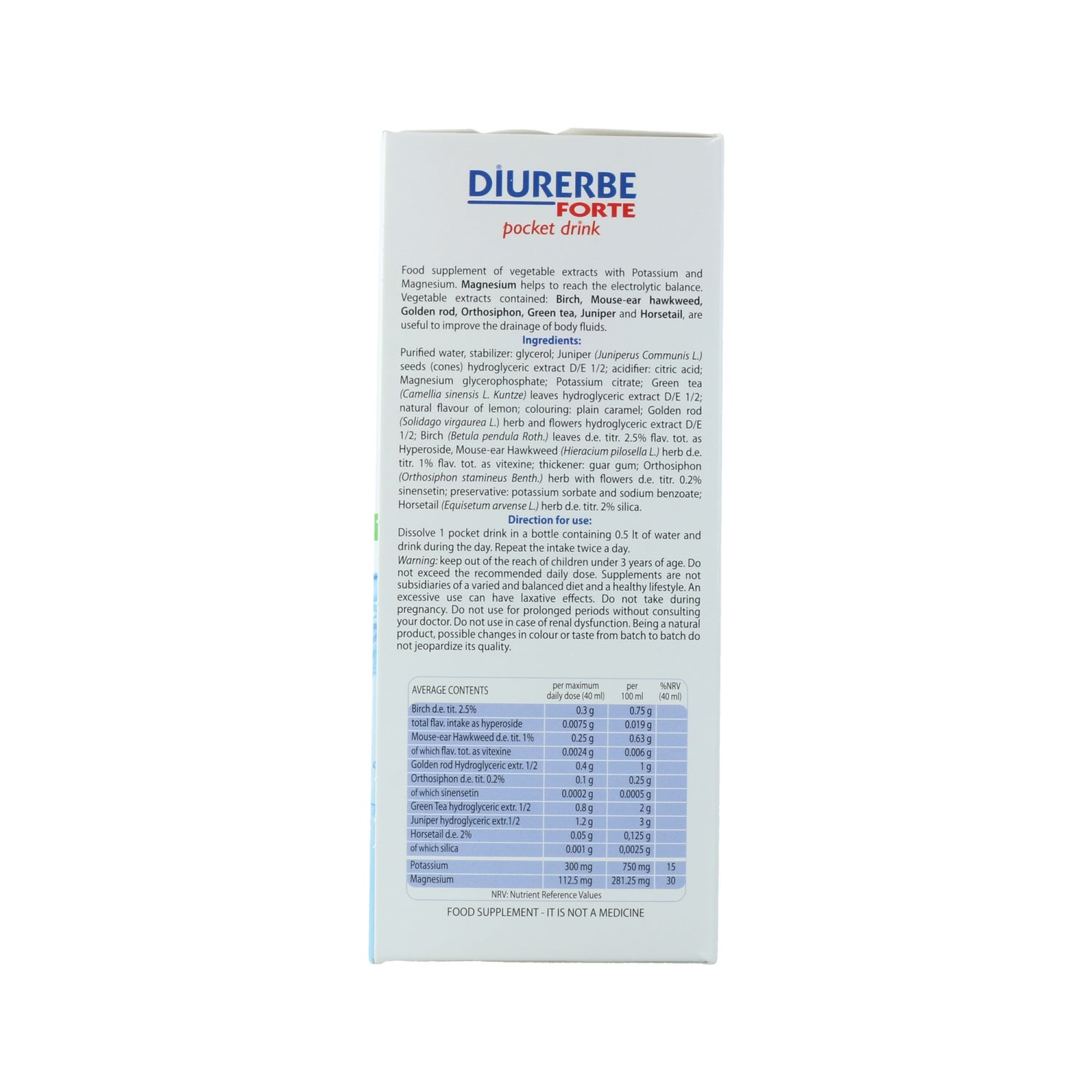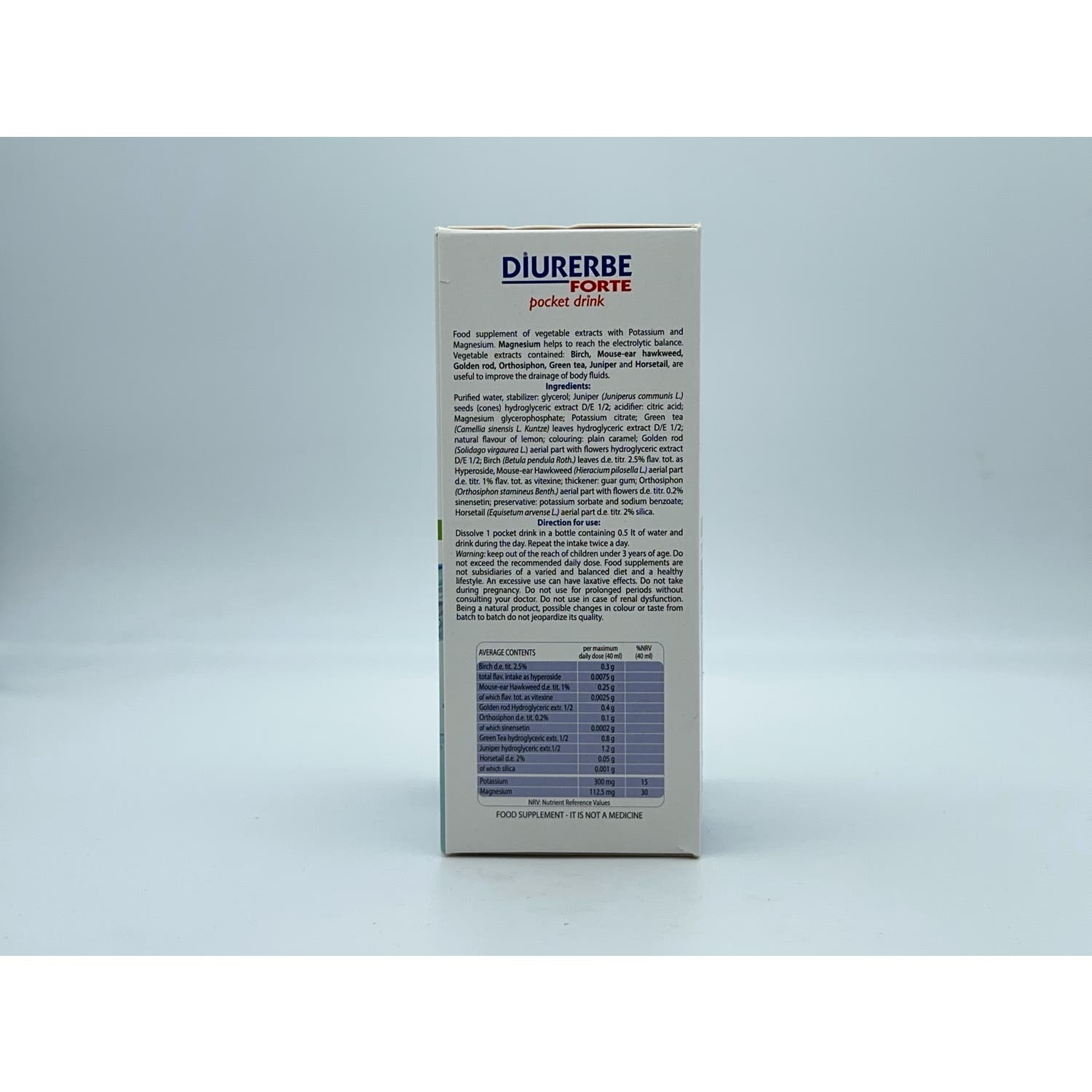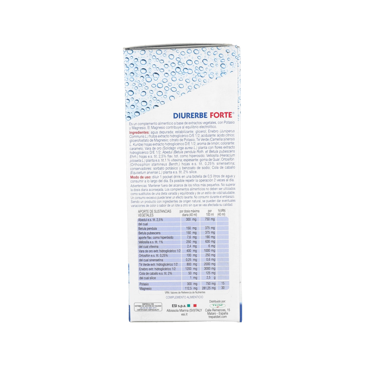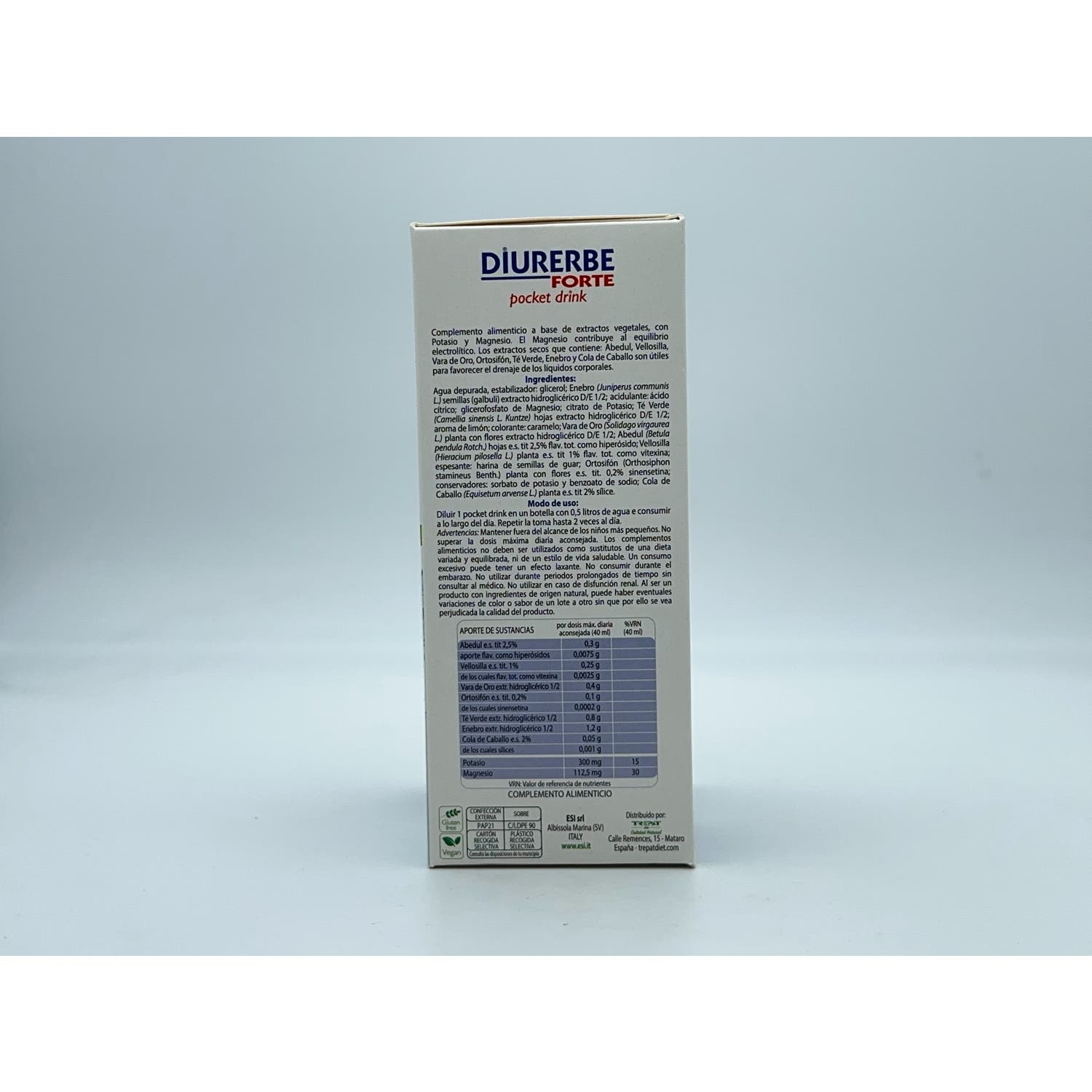Diurerbe Forte Pocket Drink ayuda a expulsar el exceso de líquido acumulado en el organismo, haciendo que te sientas más ligera y reconfortada. Reduce los edemas de las articulaciones inferiores producidos a causa de una incorrecta circulación o dieta, dejándote un ligero sabor cítrico.