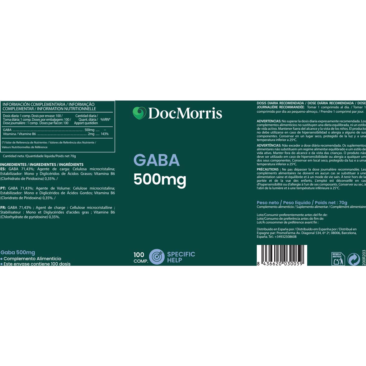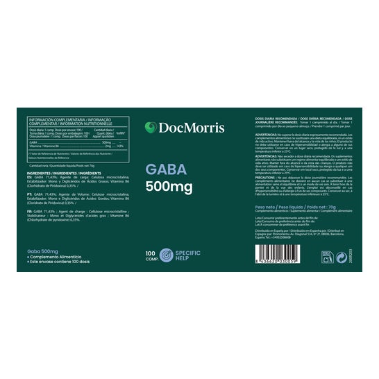 DocMorris Gaba 500mg 100 comp es un complemento alimenticio que aporta una fuente de GABA (ácido gamma aminobutírico). Se trata de un aminoácido no proteico que actúa como un neurotransmisor inhibidor en el sistema nervioso central.