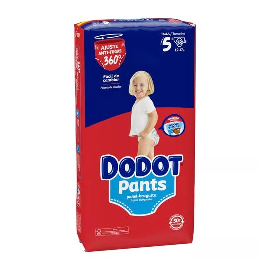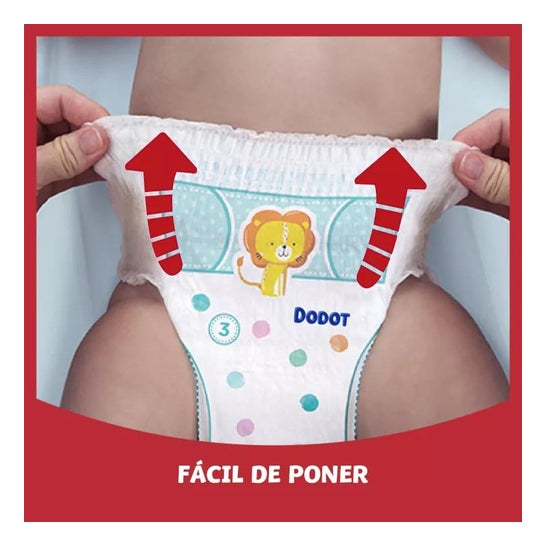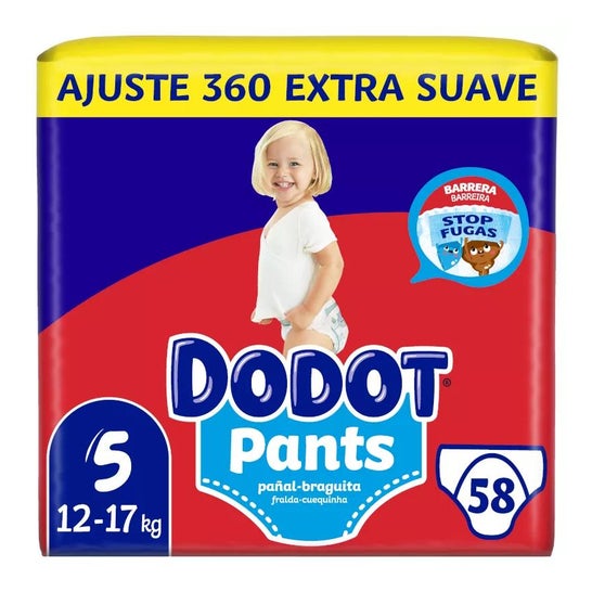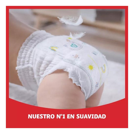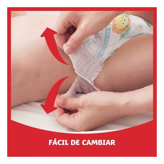 Pañal-braguita para bebés de 12 kg a 17 kg, compuestos por una doble barrera de protección y microperlas superabsorbentes que ayudan a mantener la piel del bebé seca, lo cual reduce la humedad y el riesgo de que se produzcan irritaciones cutáneas. Están diseñados anatómicamente y facilitan los movimientos del bebé sin ocasionar dificultades.