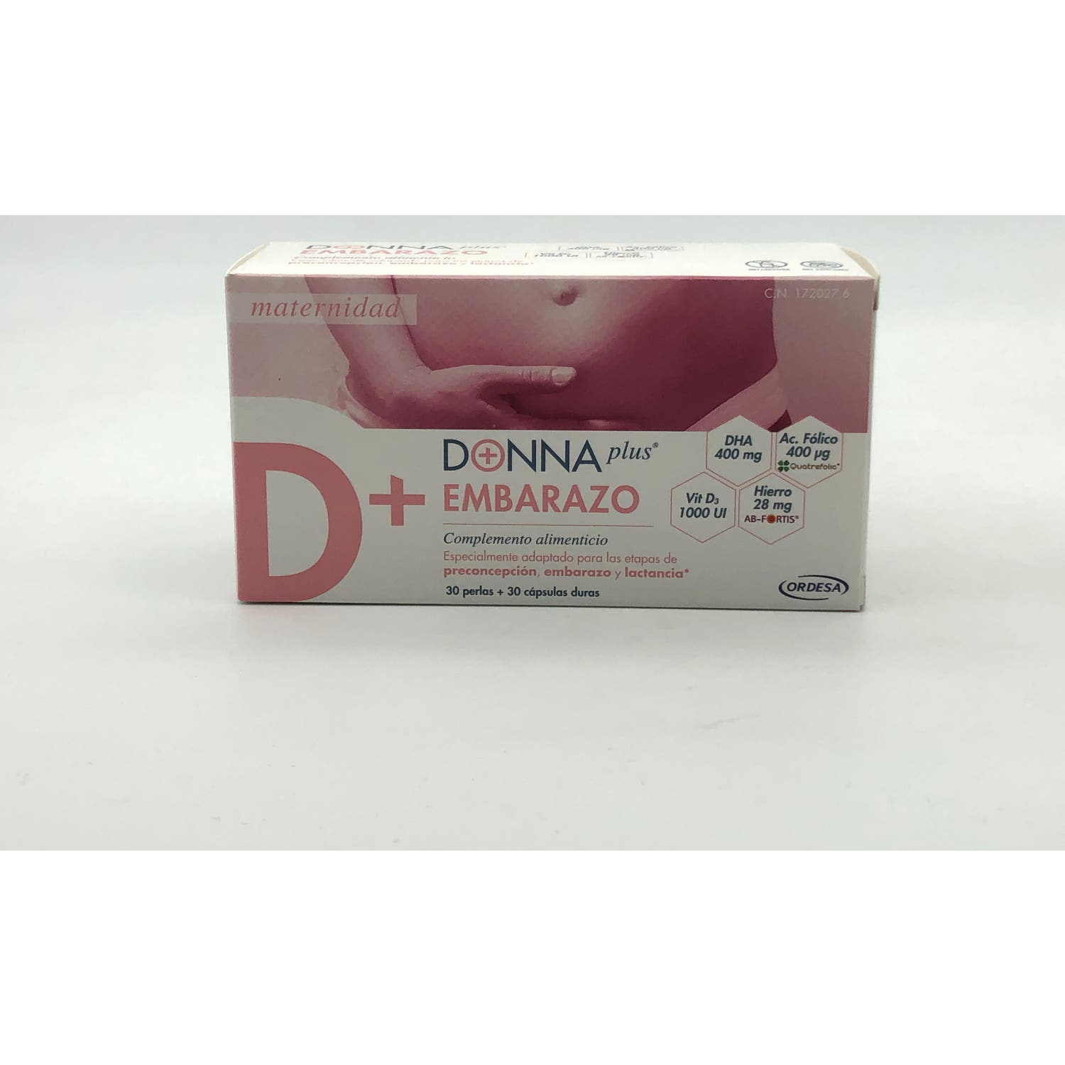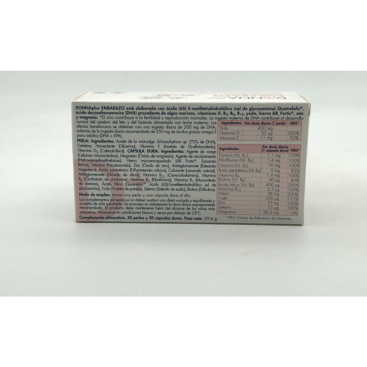 Perla: Aceite de la microalga Schizochytrium sp. (70% de DHA), Gelatina, Humectante (Glicerina), Vitamina E (Acetato de DL-alfa-tocoferilo), Viatmina D3 (Colecaciferol).
