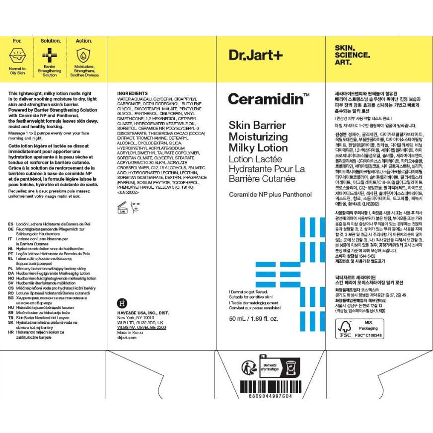 Dr.Jart+ Ceramidin Skin Barrier Moisturizing Milky Lotion de 50 ml es una loción emulsionante y ligera diseñada para proporcionar una intensa hidratación a la piel. Su formulación incluye:
