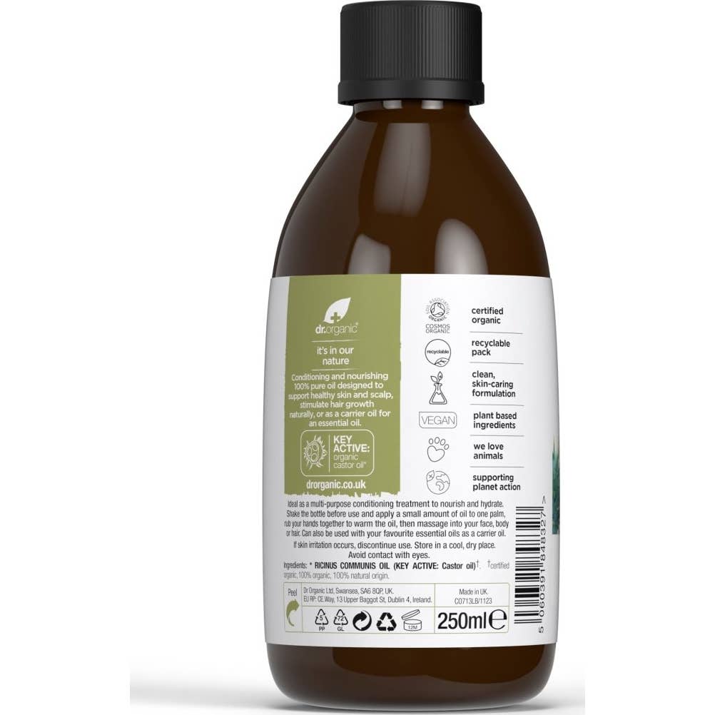 Dr. Organic Aceite de Ricino 100% Puro 250ml es un tratamiento versátil y orgánico, certificado bajo la norma COSMOS Organic. Este aceite, proveniente de la planta de ricino, destaca por sus propiedades hidratantes y su capacidad para fortalecer el cabello, las pestañas y las uñas.