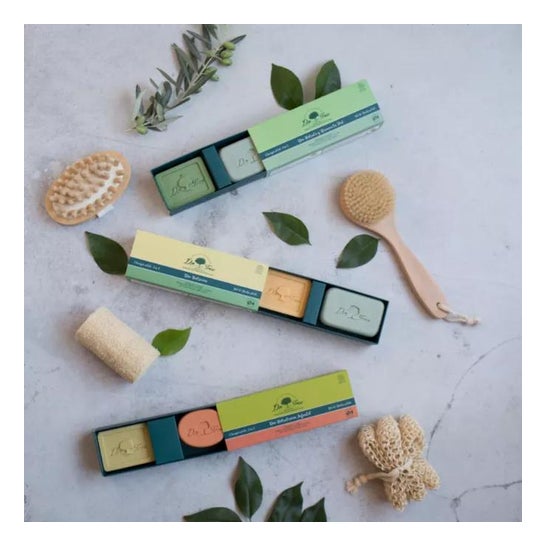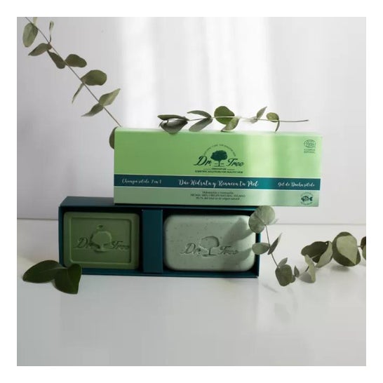 Kit de cuidado corporal que incluye un champú sólido 2 en 1 y un gel sólido para la ducha. Ayuda a exfoliar y refrescar la piel y el cabello mientras contribuye a eliminar las células muertas y toxinas de la superficie cutánea. Sus ingredientes tienen propiedades regenerantes e hidratantes. Indicado para todo tipo de piel.