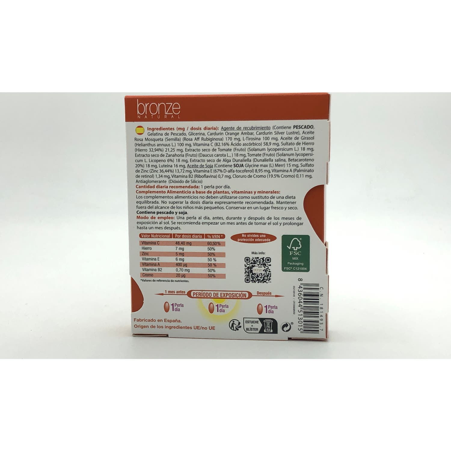 Drasanvi Bronze es un complemento alimenticio indicado para mantener las células protegidas frente al daño oxidativo. Enriquecido con aceite de rosa mosqueta, ácidos grasos esenciales, extracto seco de tomate, zanahoria y alga dunaliella, consigue mantener tu organismo protegido frente al daño externo.