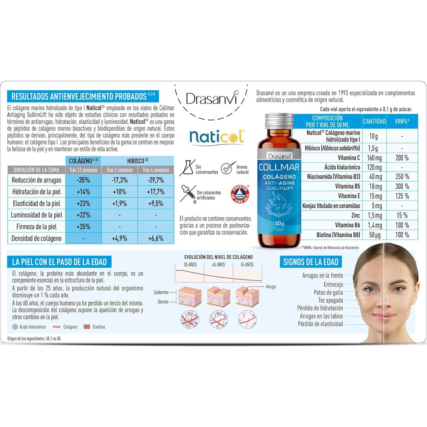Drasanvi Collmar Colágeno Antiaging SublimLift Pêssego es un complemento diseñado para contribuir a la belleza de la piel y el bienestar general. Este producto contiene colágeno marino hidrolizado de tipo I Naticol®, que ha sido respaldado por estudios clínicos que demuestran su eficacia en: