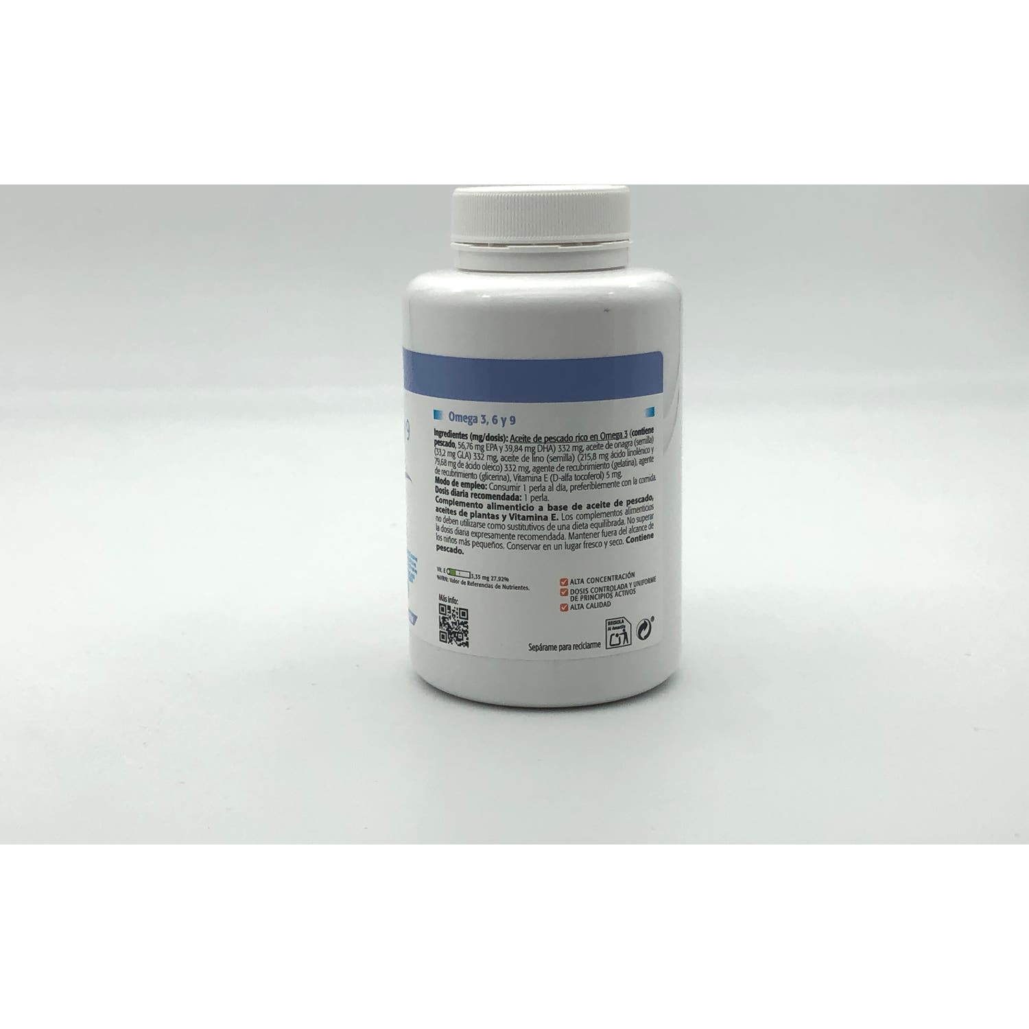 Complemento alimenticio en forma de perlas blandas, elaborado a base de aceites de semillas de lino y borraja, y aceite de pescado, que aportan una proporción adecuada de ácidos grasos omega 3, 6 y 9 al organismo.