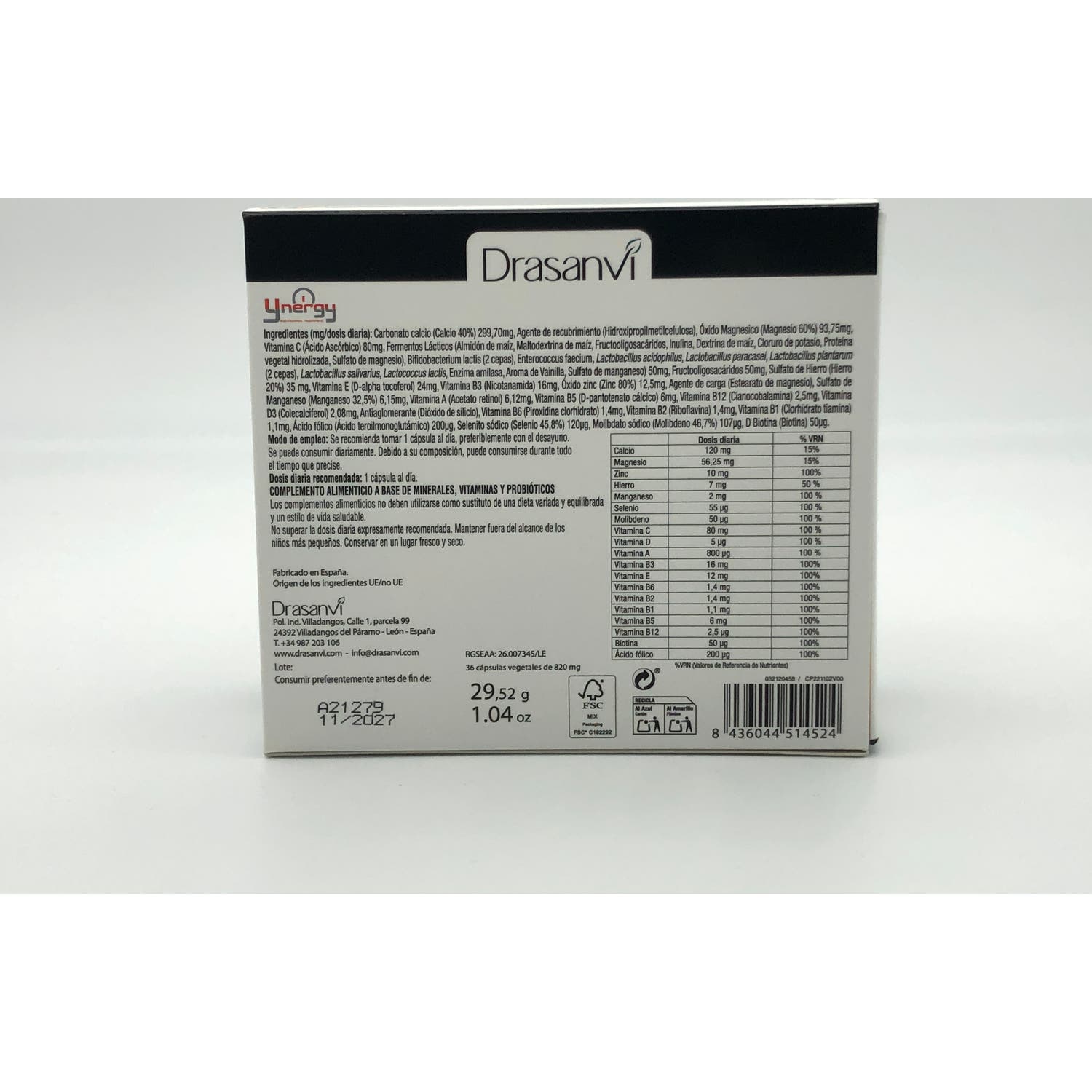 Drasanvi Ynergy Activo 36 Cáps es es complemento multivitamínico y multimineral formulado para personas adultas que precisen de un aporte vitamínico y mineral.. Su excelente combinación de vitaminas y minerales se ha enriquecido con fermentos lácticos y fibra en forma de fructooligosacáridos.