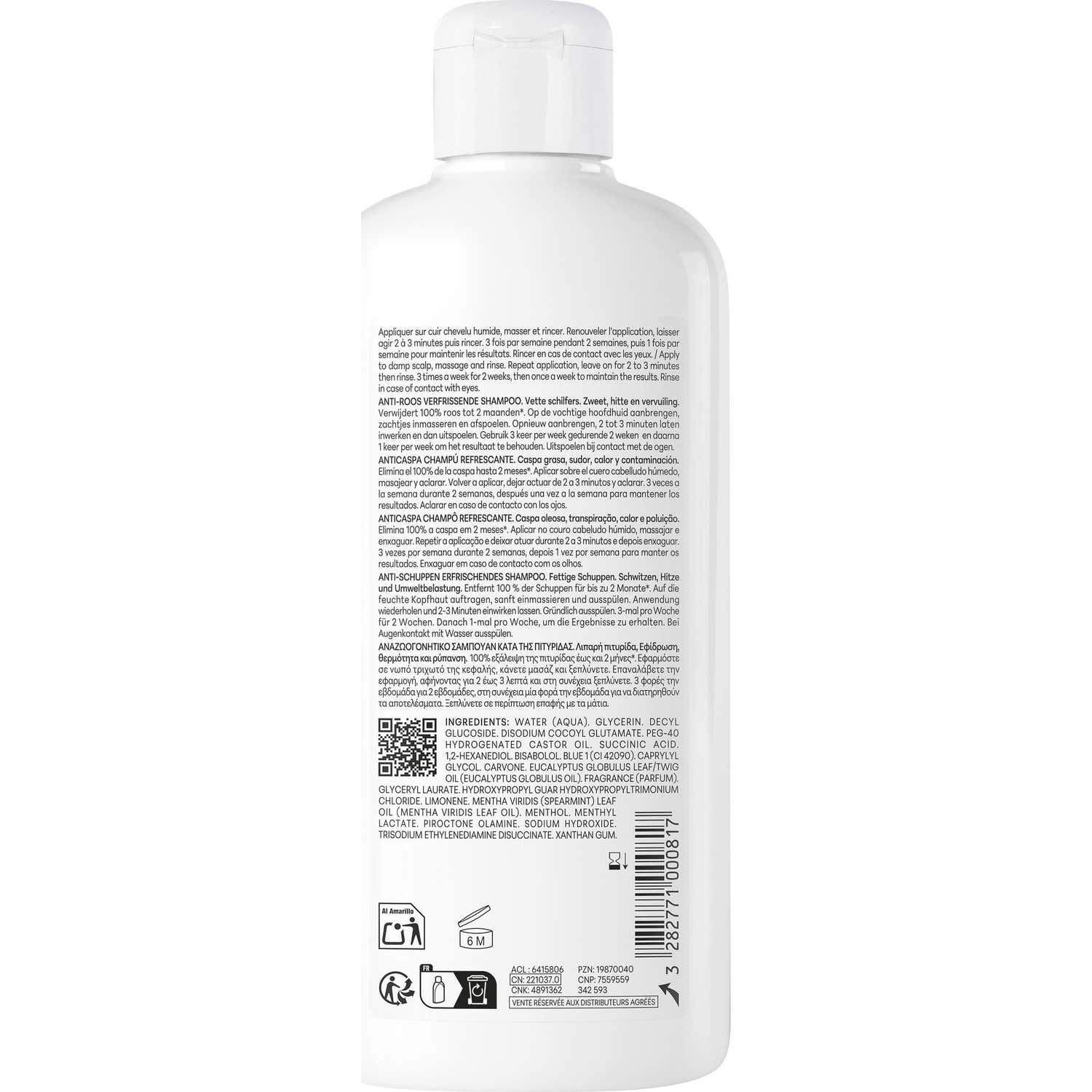 Este producto se posiciona como el primer champú anticaspa con un poder refrescante, garantizando la eliminación del 100% de las escamas visibles y las impurezas desde la primera aplicación.