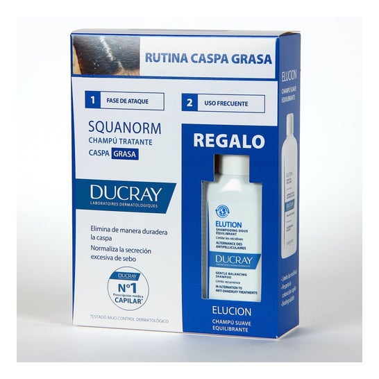 Pack de cuidado capilar que incluye un Champú Squanorm Anticaspa y un Champú Elution de uso frecuente. Ayuda a regular la producción excesiva de sebo en el cuero cabelludo y previene la descamación de la piel. En conjunto contribuyen a prevenir la reaparición de la caspa. Indicado para pieles y cabellos grasos.