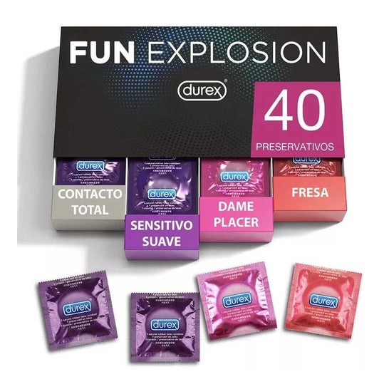 Durex Fun Explosion 40uds es un pack compuesto por una selección de preservativos variados para explorar diferentes sensaciones y añadir un extra de diversión en las relaciones sexuales.