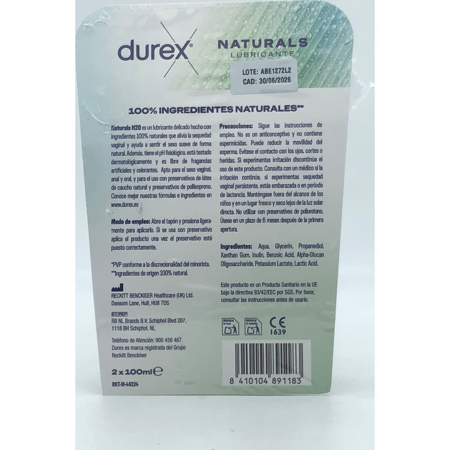Durex Naturals Lubricante H2O Original 2x100ml es un gel lubricante formulado a base de ingredientes de origen natural, compatibles con el uso de preservativos de látex y juguetes sexuales.