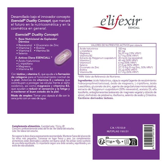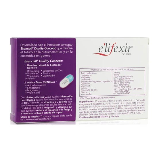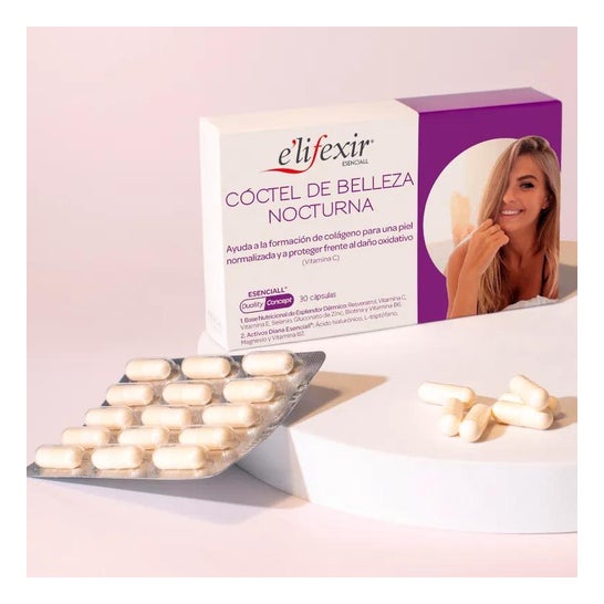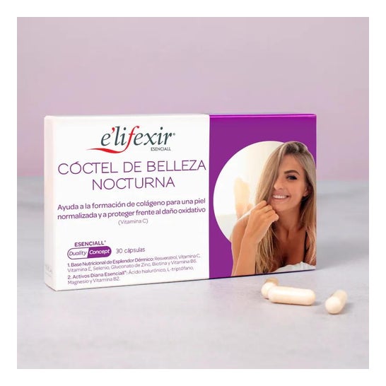 E'lifexir Cóctel de Belleza Nocturna es un tratamiento por vía oral que te aporta un conjunto de nutrientes fundamentales para mantener un buen estado cutáneo: vitamina B2, vitamina E y selenio.