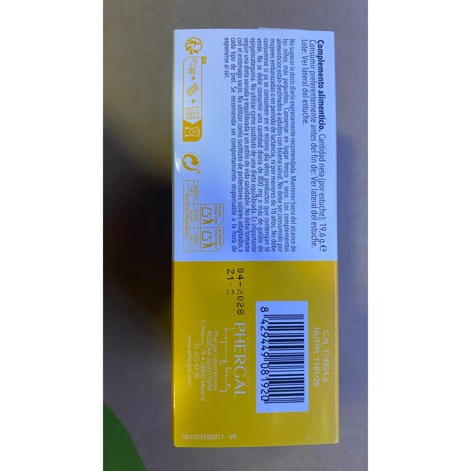 Prepara para la exposición solar, para un bronceado más intenso, duradero, uniforme y ligero. Formulado con vitaminas y minerales y extractos botánicos. Resveratrol, vitamina C, selenio, biotina, vitamina B6, vitamina E y gluconato de zinc que nutren, reparan, protegen y promueven sinérgicamente una piel sana, protegida y regenerada. Extracto de licopeno y té verde con acción antioxidante frente a la radiación UV, minimiza el envejecimiento celular y la luteína que contribuye a la protección ocular.