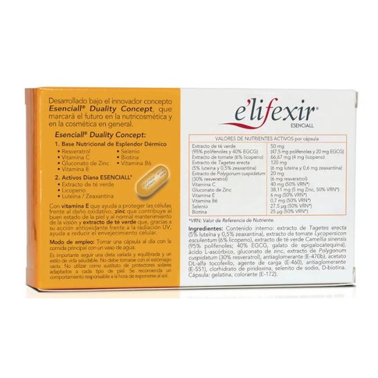 Este producto de Elifexir es un complemento alimenticio nutricosmético en forma de cápsulas. Gracias a sus principios activos, ayuda a proteger y colabora con la salud de la piel y los ojos. Embellece la piel mientras favorece el desarrollo del colágeno y la regeneración celular. Con efecto antioxidante, protege de las radiaciones UV evitando el envejecimiento celular.