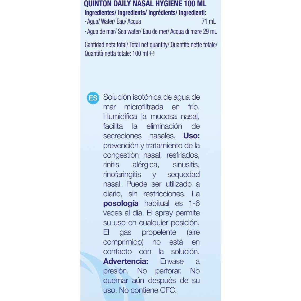 Eau de Quinton Daily Nasal Spray 100ml es una solución isotónica de agua de mar microfiltrada en frío, diseñada para humedecer la mucosa nasal y facilitar la eliminación de las secreciones.