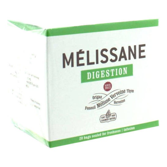Estas tisanas difunden en cada taza los beneficios de las plantas que componen el agua de melisa de los Carmes. Nueva variante del Agua de melisa, Mélissane aporta ahora los beneficios de esta en forma de infusión. Mélissane Digestión recupera sus virtudes antiespasmódicas y estimulantes, gracias a activos 100% de origen natural que entran en la composición del Agua de Melisa. Invitan a la relajación y al bienestar y se disfrutan en el momento de una pausa, un placer simple redescubierto.