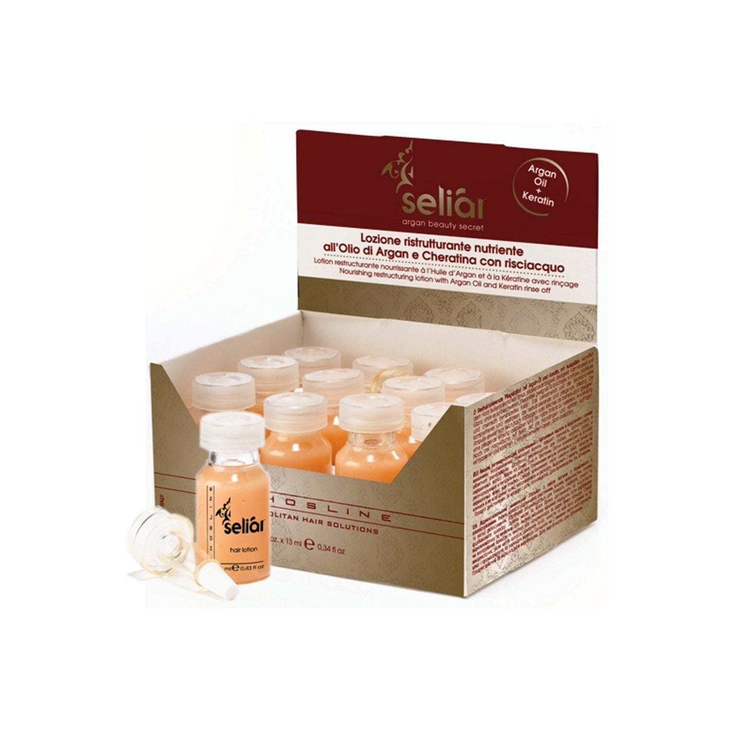 Echos Line Seliár Argan Lotion 12x13ml es un tratamiento capilar intensivo diseñado para la reconstrucción y nutrición profunda del cabello. Esta loción está formulada para revitalizar cabellos frágiles, débiles, secos o tratados químicamente, proporcionando una solución eficaz para restaurar su salud y aspecto.
