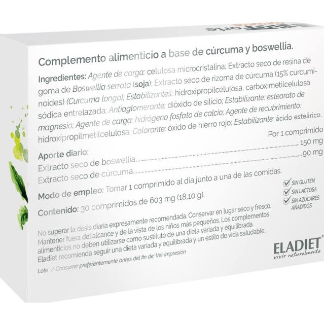 Eladiet Fito Forte Cúrcuma 30 Comp. es un suplemento alimenticio que contiene cúrcuma, una planta con propiedades antioxidantes y antiinflamatorias, ideal para mantener la salud articular. Este complemento bicapa combina cúrcuma y boswellia, con una acción inmediata gracias a la primera capa y una acción más duradera con la liberación prolongada de la segunda capa. Se recomienda tomar 1 comprimido al día, preferiblemente con las comidas principales. No superar la dosis diaria recomendada y conservar en un lugar fresco y seco, fuera del alcance de los niños. Los complementos alimenticios no deben sustituir una dieta variada y equilibrada.