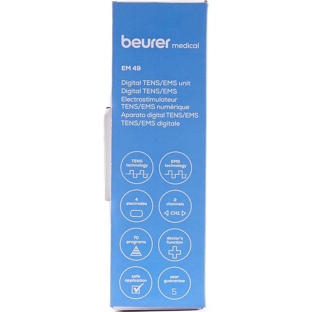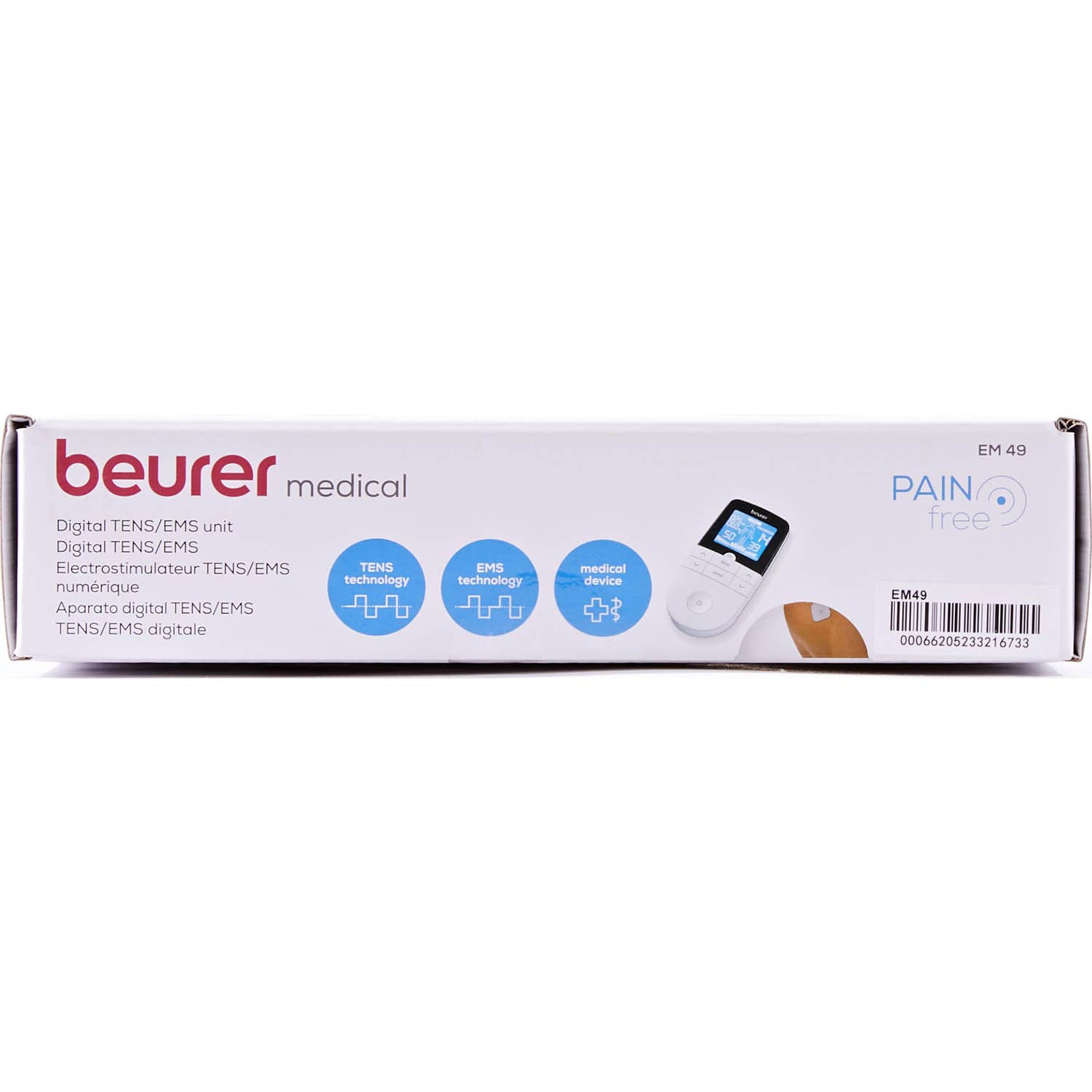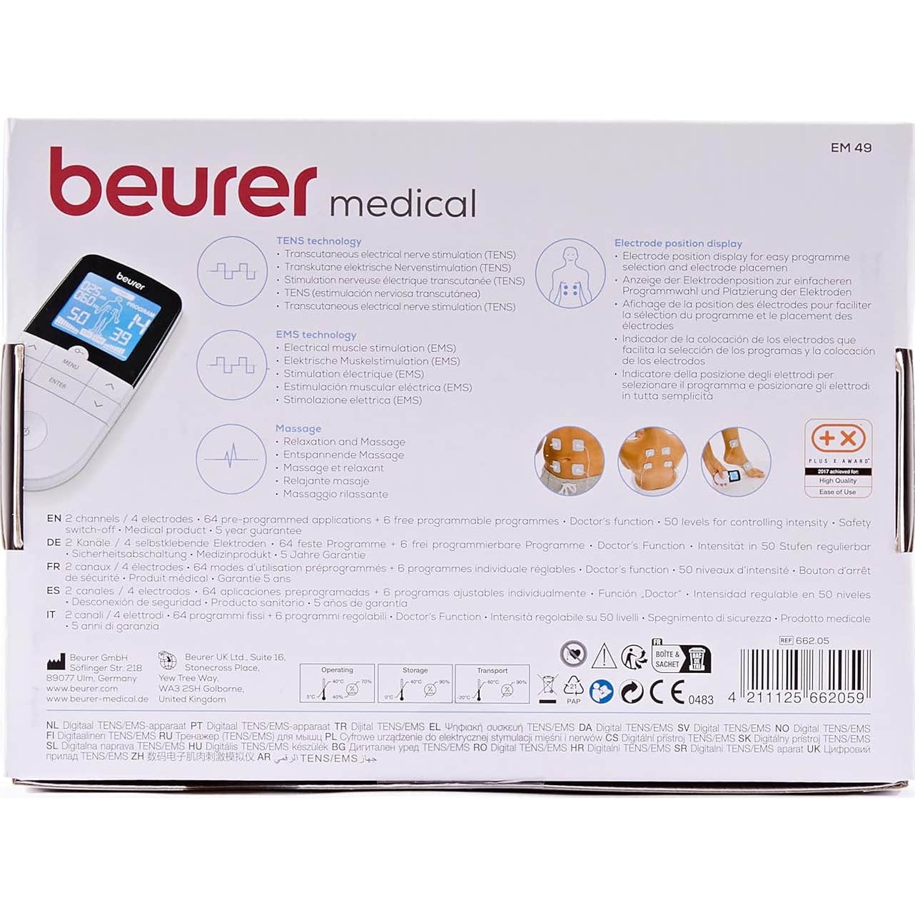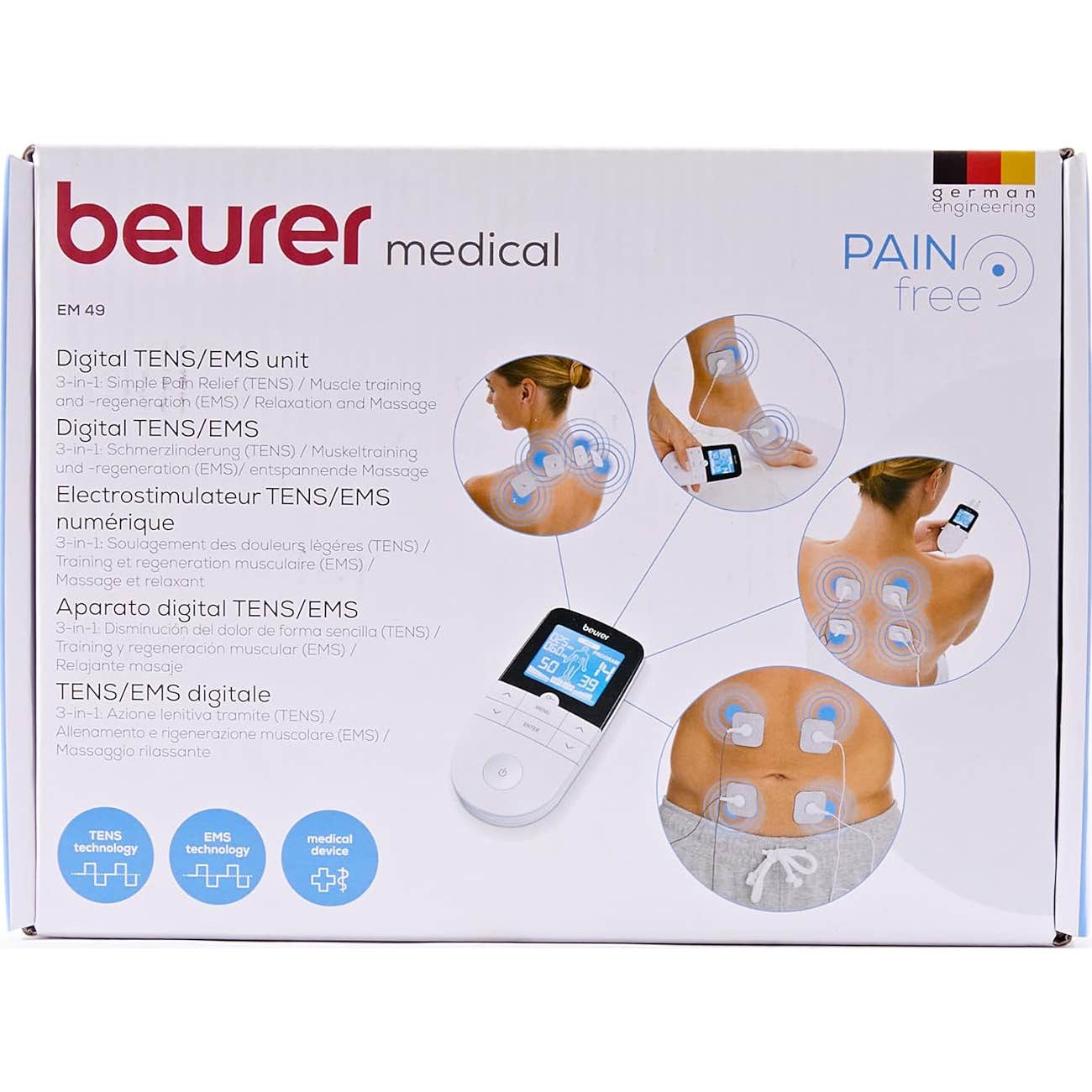 Un electroestimulador digital para la zona muscular. Este producto de Beurer se enfoca al entrenamiento y a la regeneración muscular, así como al masaje relajante. El electroestimulador digital presenta 3 funciones básicas: TENS, EMS y de masaje. El aparato EMS/TENS se compone de 64 aplicaciones preprogramadas. Sin embargo, se puede personalizar el ancho del pulso, el tiempo de encendido y apagado y la frecuencia, en base a las preferencias del usuario. El electroestimulador funciona con 4 electrodos que se pueden colocar en cualquier zona del cuerpo (espalda, abdomen o pies). Los estímulos eléctricos son seguros y prácticamente indoloros; se percibe una vibración suave y cómoda, como un cosquilleo. Cabe destacar que el producto es unisex, es decir, es apto tanto para hombres como para mujeres. Se recomienda consultar su uso con un médico especialista.
