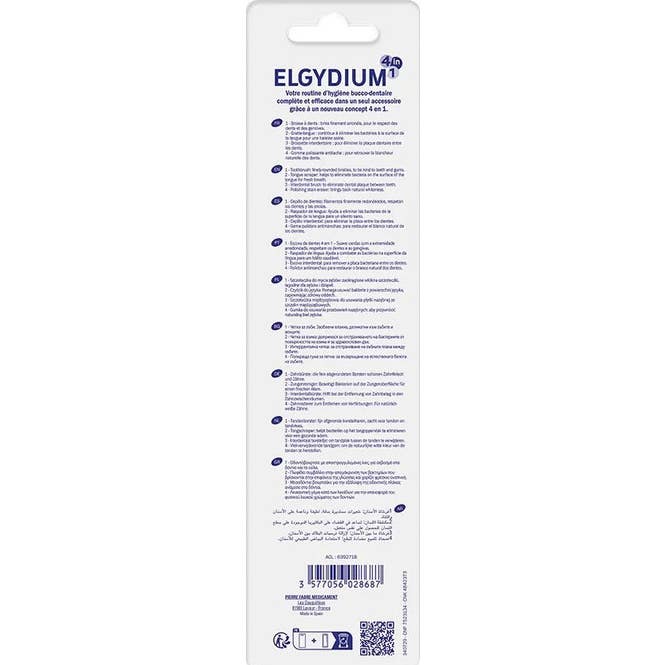 Elgydium Cepillo Dental 4 en 1 Suave a Medio es una solución integral para mantener una higiene bucal excepcional. Este innovador cepillo combina múltiples funciones en un solo producto, facilitando: