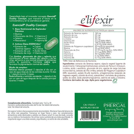 Contenido Interno: Extracto De Serenoa Repens, Extracto De Mijo, L-Cistina, Agente De Carga (E-460), Ácido L-Ascórbico, Gluconato De Zinc, Extracto De Uva, Extracto De Polygonum Cuspidatum (30% Resveratrol), Acetato Dl-Alfa Tocoferilo, Antiaglomerante (E-470b), Estabilizante (E-551), Colecalciferol, Clorhidrato De Piridoxina, Sulfato De Cobre, Ácido Pteroilmonoglutámico, Selenito De Sodio, D-Biotina. Cápsula: Gelatina, Colorantes (E-171, E-172, E-132). Contiene Derivados De Soja.