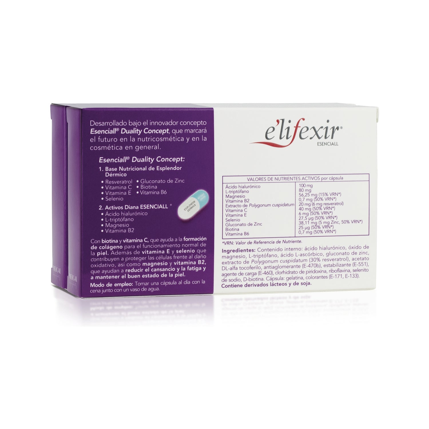 Elifexir Esenciall Coctel de Belleza Nocturno 60 cápsulas es un complemento alimenticio que ayuda a la formación de colágeno para una piel normalizada y a proteger contra el daño oxidativo. Desarrollado bajo el innovador concepto Esenciall Duality Concept, que marca el futuro en la nutricosmética y en la cosmética en general. Contiene Resveratrol, Vitamina c, Vitamina e, Selenio, Gluconato de Zinc, Biotina, Vitamina b6, Ácido hialurónico, L-triptófano, Magnesio y Vitamina b2. Con biotina y vitamina c para la formación de colágeno, vitamina e y selenio para proteger las células contra el daño oxidativo, y magnesio y vitamina b2 para reducir el cansancio y la fatiga y mantener la piel en buen estado.