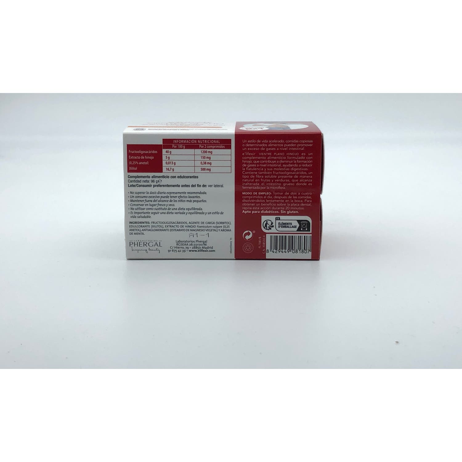 Complemento alimenticio en forma de comprimidos, elaborado a base de fibra prebiótica y extractos de hinojo, que contribuye a mejorar problemas del sistema digestivo, como: