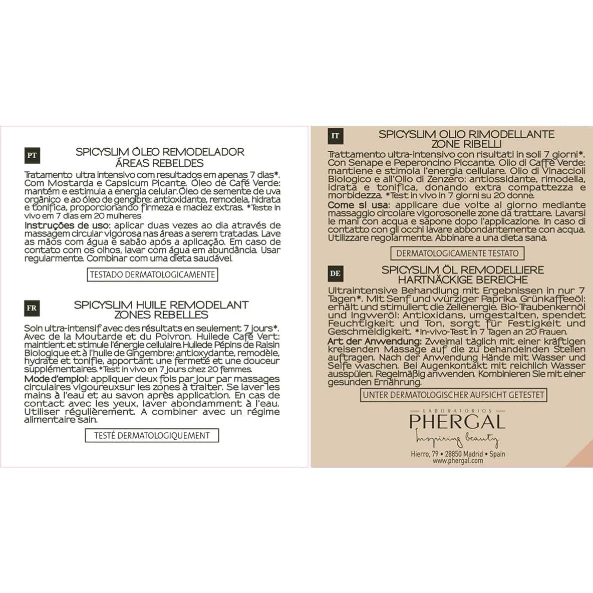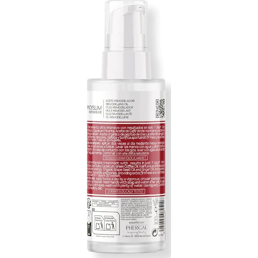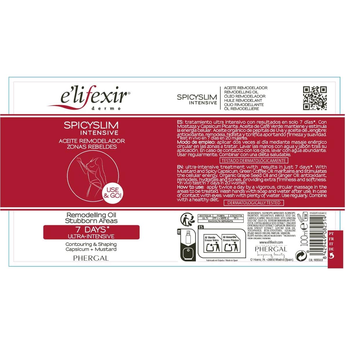 Elifexir Spicyslim Aceite Inductor Quemagrasas 100ml aceite seco que está especialmente diseñado para quemar la grasa en las zonas más difíciles.Los resultados son visibles en tan solo 7 días. Su fórmula contiene mostaza orgánica y capsicum picante que estimulan la reducción de grasa. Idóneo para redefinir tu figura y reducir el contorno del cuerpo.
