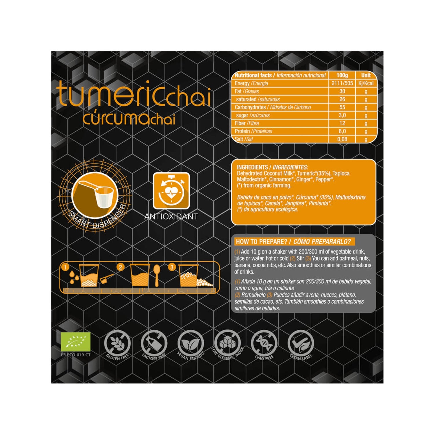 Polvo con cúrcuma y chai de especial interés para deportistas que experimentan síntomas inflamatorios frecuentes a nivel estomacal. Posee fuertes propiedades antiinflamatorias. Fuente de antioxidantes. Deliciosa combinación de sabor entre dulce y picante.