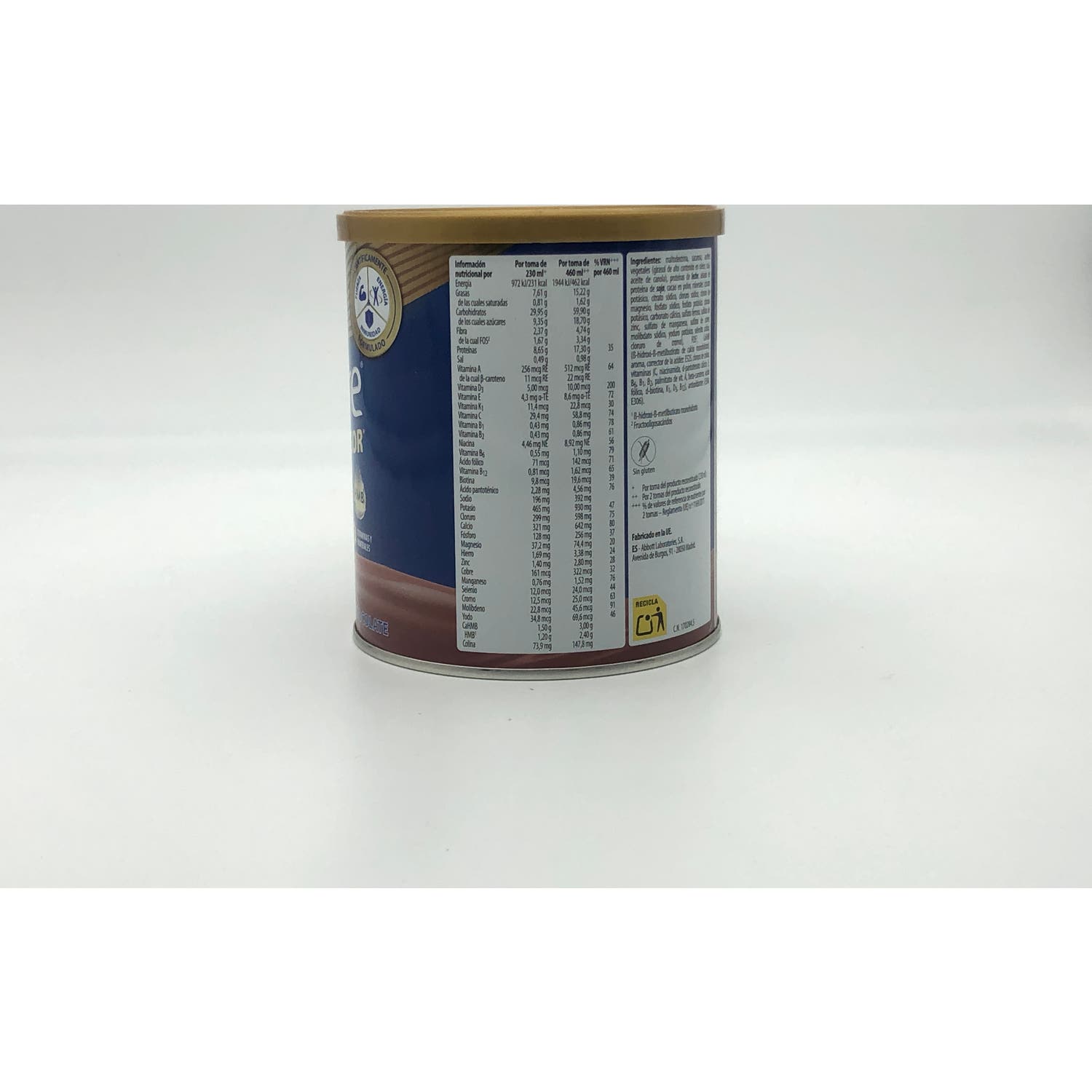 Maltodextrina, sacarosa, aceites vegetales (girasol de alto contenido en oleico, soja, canola), proteínas de LECHE, aislado de proteína de SOJA, cacao en polvo, minerales (citrato potásico, citrato sódico, cloruro sódico, cloruro de magnesio, fosfato sódico, fosfato potásico, cloruro potásico, carbonato cálcico, sulfato ferroso, sulfato de zinc, sulfato de manganeso, sulfato de cobre, molibdato sódico, yoduro potásico, selenito sódico, cloruro de cromo), FOS **, CaHMB *, aroma, corrector de la acidez: E525, cloruro de colina, vitaminas (C, niacinamida, d-pantotenato cálcico, E, B6, B1, B2, palmitato de vit. A, beta-caroteno, ácido fólico, d-biotina, K1, D3, B12), antioxidantes (E304, E306).