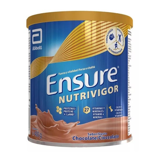 Ensure Nutrivigor Sabor Chocolate 400g complementa la nutrición de los adultos. Ofrece los nutrientes básicos para fortalecer el cuerpo. La toma de este alimento líquido de chocolate ayuda a disminuir la fatiga y el cansancio y a mantener la calidad ósea y de los músculos.
