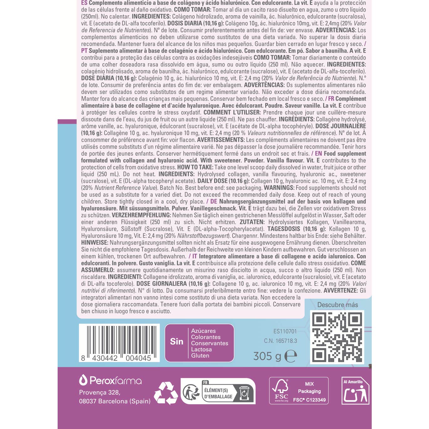 Ingredientes: Colágeno hidrolizado porcino, aroma de vainilla, ácido hialurónico (sal sódica),