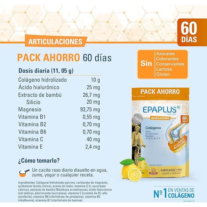 Epaplus Arthicare Colágeno Silicio Sabor Limón 668g es un complemento alimenticio que contribuye al mantenimiento y funcionamiento óptimo de huesos y articulaciones y ayuda a prevenir el desgaste del cartílago.