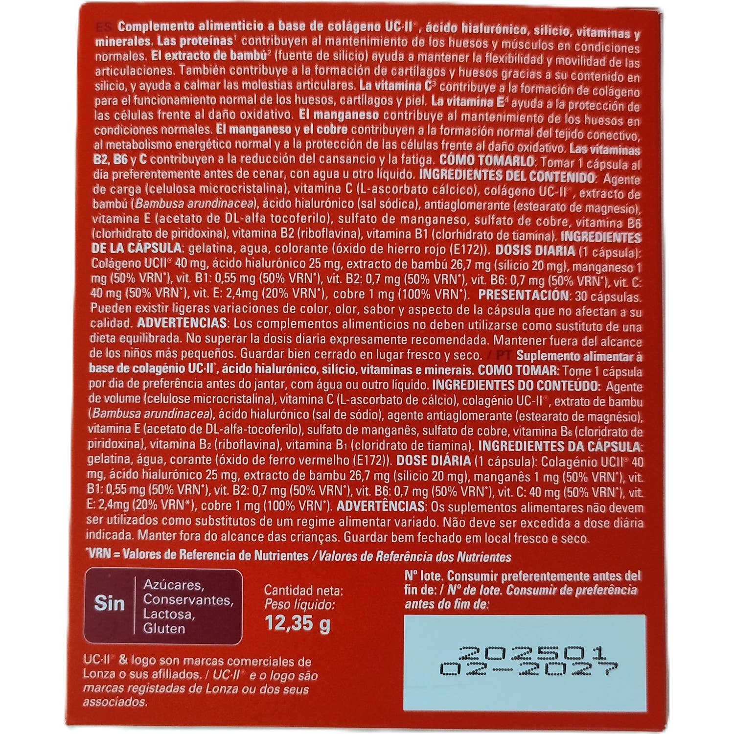Contiene colágeno, para contribuir al sistema inmune, extracto de bambú para calmar las molestias, manganeso para el mantenimiento de los huesos y cobre, para mantener el tejido conectivo.