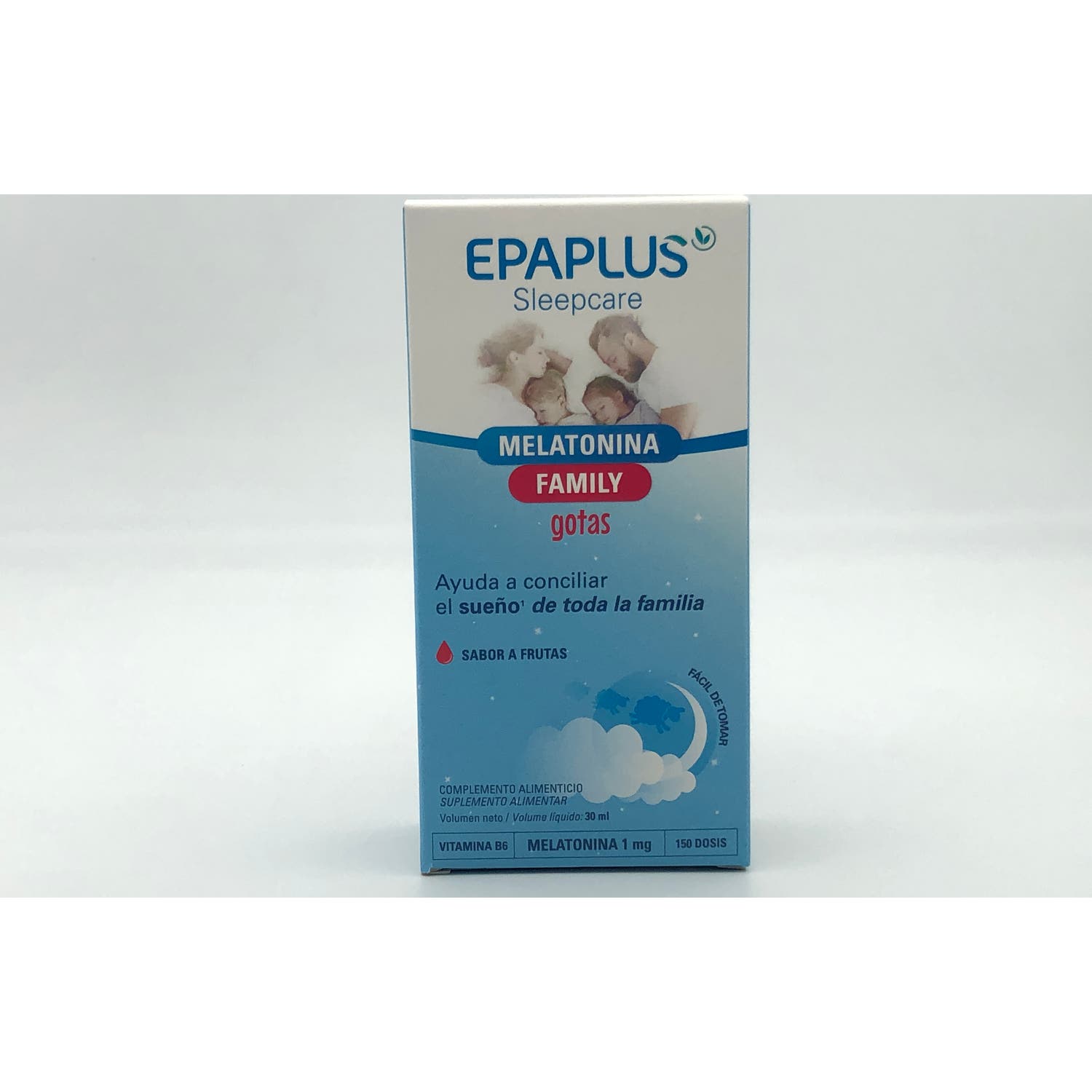 Epaplus Sueño Melatonina Family Gotas 30ml complemento alimenticio presentado en formato de frasco con gotero. producto elaborado a base de melatonina y vitamina b6. la composición contribuye al descanso nocturno. el contenido de 4 gotas, equivale a 1 mg de melatonina, cantidad necesaria para ayudar a disminuir el tiempo de conciliación del sueño. por otro lado, el contenido en vitamina b6, ayuda a disminuir el cansancio y la fatiga.presenta sabor a frutas. apto para adultos y niños a partir de 3 años.