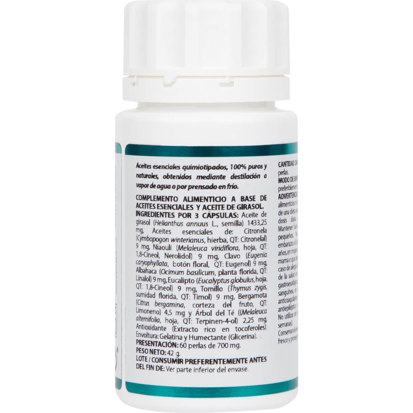 Composición por perla: Aceite de girasol (Helianthus annuus L.); aceites esenciales de: citronela (Cymbopogon winterianus Jowitt ex Bor., hierba, QT: citronelal); niaouli (Melaleuca viridiflora Sol. ex Gaertn., hoja, QT: 1,8-cineol, nerolidol); clavo (Eugenia caryophyllata (L.) Merr., botón floral, QT: eugenol; albahaca (Ocimum basilicum L., planta florida, QT: linalol); eucalipto (Eucalyptus globulus Labill., hoja, QT: 1,8-cineol); tomillo (Thymus zygis Loefl. ex L., sumidad florida, QT: timol); bergamota (Citrus x bergamina Risso & Poit., corteza del fruto, QT: limoneno); árbol del té (Melaleuca alternifolia (Maiden y Betche) Cheel, rama con hoja, QT: terpinen-4-ol) extracto rico en tocoferoles (antioxidante), 2 mg. Envoltura: gelatina y humectante (glicerina).