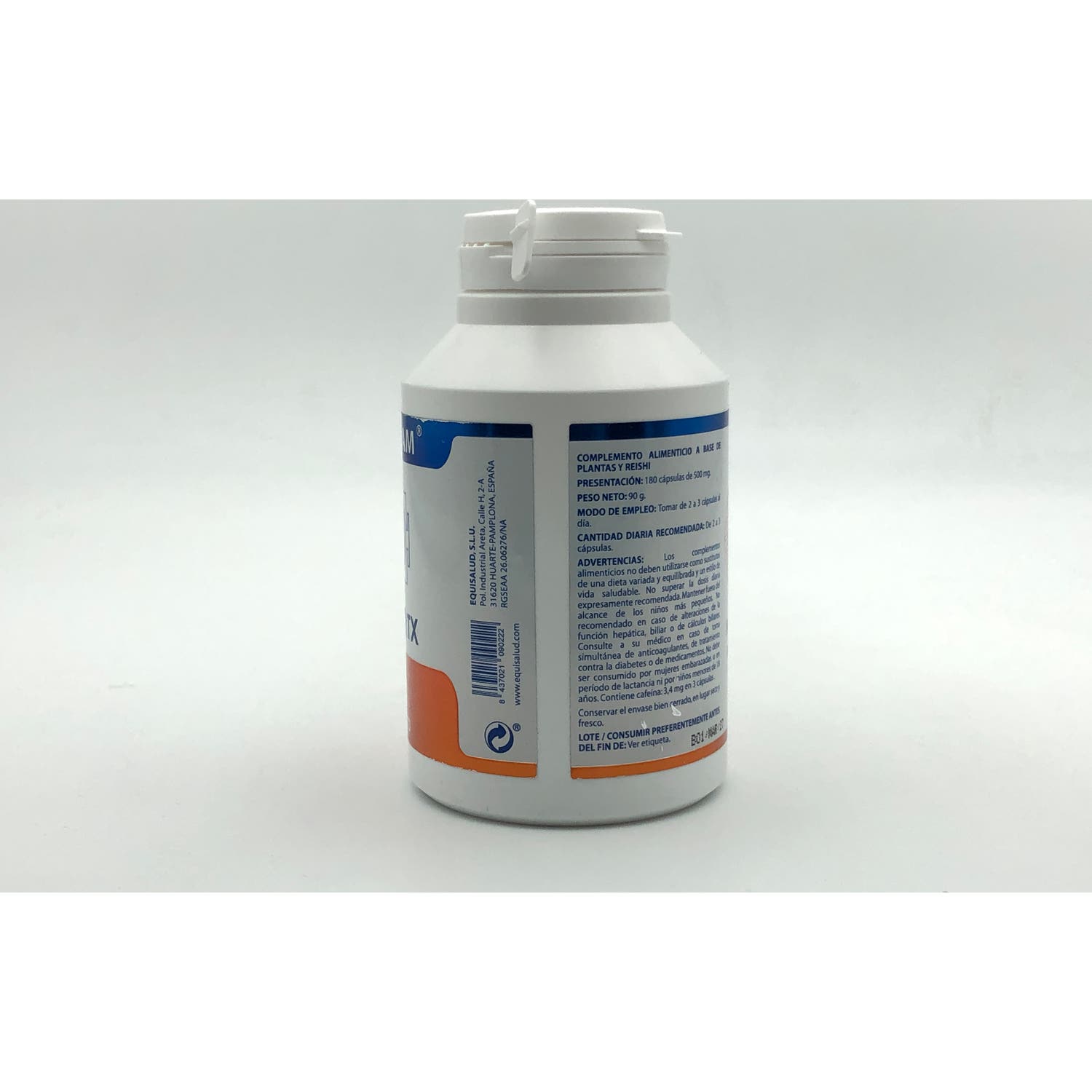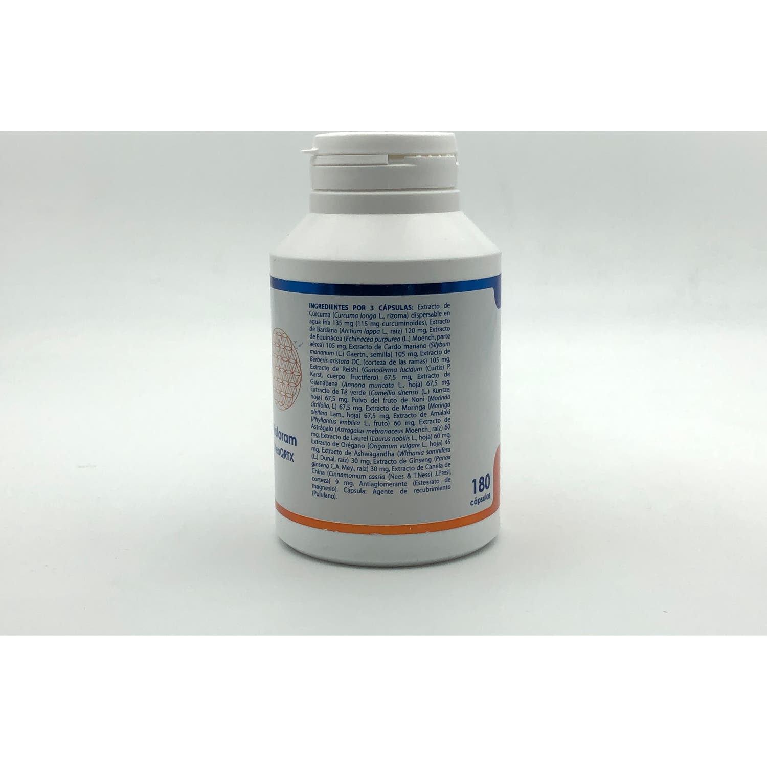Composición por cápsula: HydroCurc® (cúrcuma dispersable en agua fría (90% extracto de Curcuma longa L.), 85% curcuminoides totales), 45 mg; guanábana o graviola extracto seco (Annona muricata L.), 22,5 mg; berberina extracto seco (Berberis aristata DC.), 35 mg; bardana extracto seco (Arctium lappa L.), 40 mg; amla o amalaki extracto seco (Phyllantus emblica L.), 20 mg; cardo mariano extracto seco (Silybum marianum (L.) Gaertn.), 35 mg; té verde extracto seco (Camellia sinensis (L.) Kuntze), 22,5 mg; laurel extracto seco (Laurus nobilis L.), 20 mg; reishi extracto seco (Ganoderma lucidum (Curtis) P. Karst), 22,5 mg; astrágalo extracto seco (Astragalus mebranaceus Moench.), 20 mg; orégano extracto seco (Origanum vulgare L.), 15 mg; ashwagandha extracto seco (Withania somnifera (L.) Dunal), 10 mg; polvo del fruto de noni (Morinda citrifolia L, 22,5 mg; moringa extracto seco (Moringa oleifera Lam.), 22,5 mg; equinácea extracto seco (Echinacea purpurea (L.) Moench), 35 mg; ginseng extracto seco (Panax ginseng C.A. Mey.), 10 mg; canela de China extracto seco (Cinnamomum cassia (Nees & T. Ness) J. Presl), 3 mg. Excipiente tecnológico: estearato de magnesio (antiaglomerante), c.s. Envoltura: polisacárido de origen vegetal (pululano).