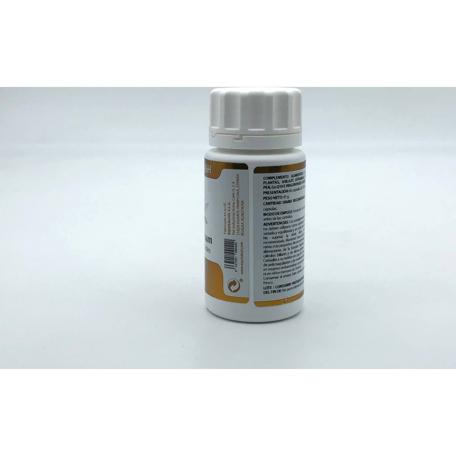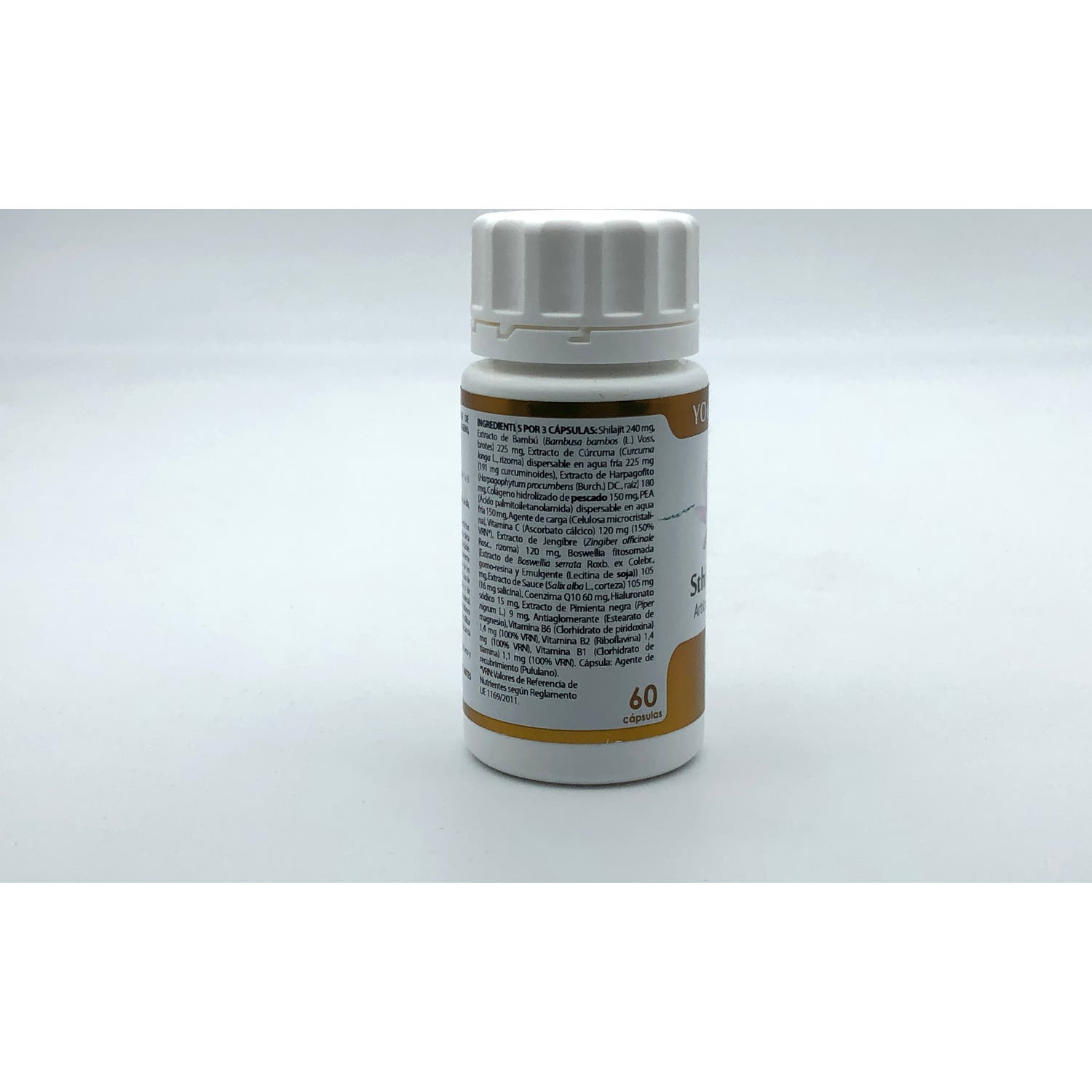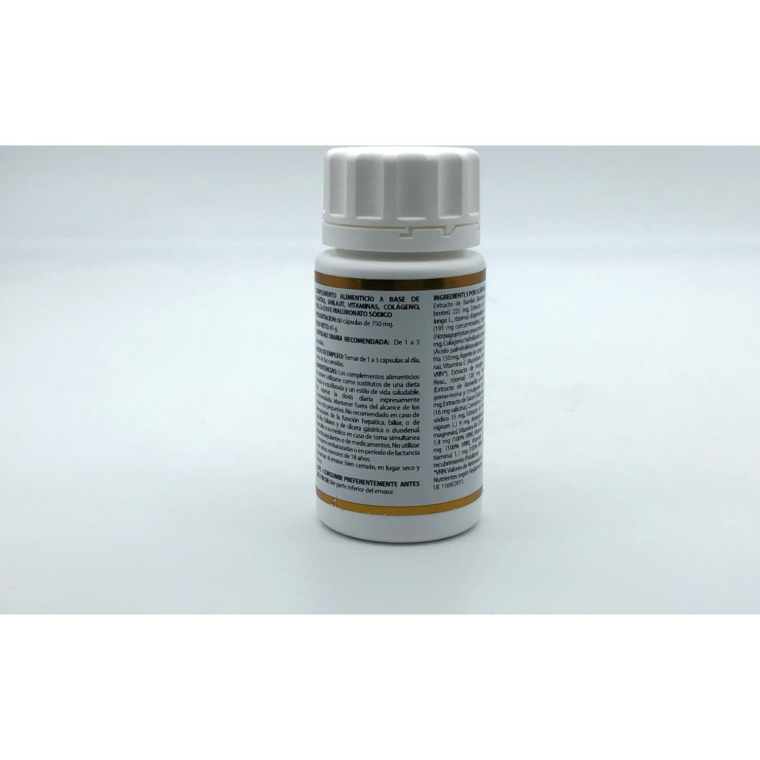 Composición por cápsula: PrimaVie® (shilajit purificado, >50% ácidos fúlvicos, > 10,3% Dibenzo-α-pironas más Dibenzo-α-pironas cromoproteínas), 80 mg; bambú extracto seco (Bambusa bambos (L.) Voss, brotes, 75% sílice, ratio 10:1), 75 mg; HydroCurc® (cúrcuma dispersable en agua fría (90% extracto de Curcuma longa L., raíz), 85% curcuminoides totales), 75 mg; harpagofito extracto seco (Harpagophytum procumbens (Burch.) DC., raíz secundaria, 2% harpagósidos), 60 mg; colágeno hidrolizado de pescado (peso molecular 5000 Da, 90% proteínas), 50 mg; Levagen® Plus (PEA dispersable en agua fría (90% ácido palmitoiletanolamida)), 50 mg; ascorbato cálcico (82,64% vitamina C), 48,5 mg; jengibre extracto seco (Zingiber officinale Rosc., rizoma 5% gingeroles), 40 mg; Casperome® (boswellia fitosomada (extracto de Boswellia serrata Roxb. ex Colebr., gomo-resina y lecitina de soja), 25% ácidos triterpénicos totales, 10% ácido β-boswélico, ratio 3-9:1), 35 mg; sauce extracto seco (Salix alba L., corteza, 15% salicina, ratio 6-8:1), 35 mg; coenzima Q10, 20 mg; hialuronato sódico, 5 mg; pimienta negra extracto seco (Piper nigrum L., fruto, 95% piperina, ratio 25:1), 3 mg; clorhidrato de piridoxina (82,29% vitamina B6), 0,6 mg; riboflavina (vitamina B2), 0,5 mg; clorhidrato de tiamina (78,68% vitamina B1), 0,5 mg. Excipientes tecnológicos: celulosa microcristalina (agente de carga), c.s. y estearato de magnesio (antiaglomerante), c.s.