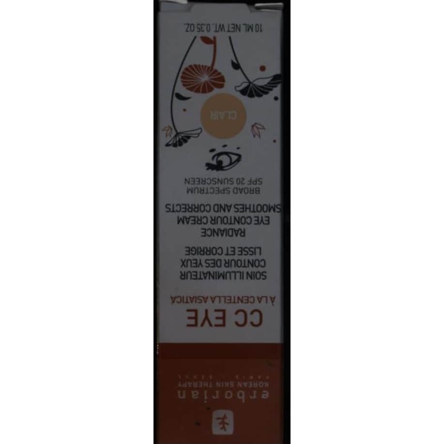 Erborian CC Eye Clair 10ml es un tratamiento iluminador del contorno de ojos con Centella Asiática que alisa y corrige el aspecto de las bolsas y ojeras. Formulado con Centella Asiática, que posee propiedades calmantes, y gracias a los pigmentos encapsulados que se funden con la piel, el tratamiento unificador e iluminador para el contorno de ojos de Erborian hidrata y alisa las líneas de expresión y las arrugas, y disimula al instante la apariencia de bolsas y ojeras, iluminando la mirada.Tono claro adecuado para pieles muy claras a claras, con subtonos rosados o neutros. Dermatológicamente testado. Sin perfume. Con protección FPS 20. Fabricado en Corea.